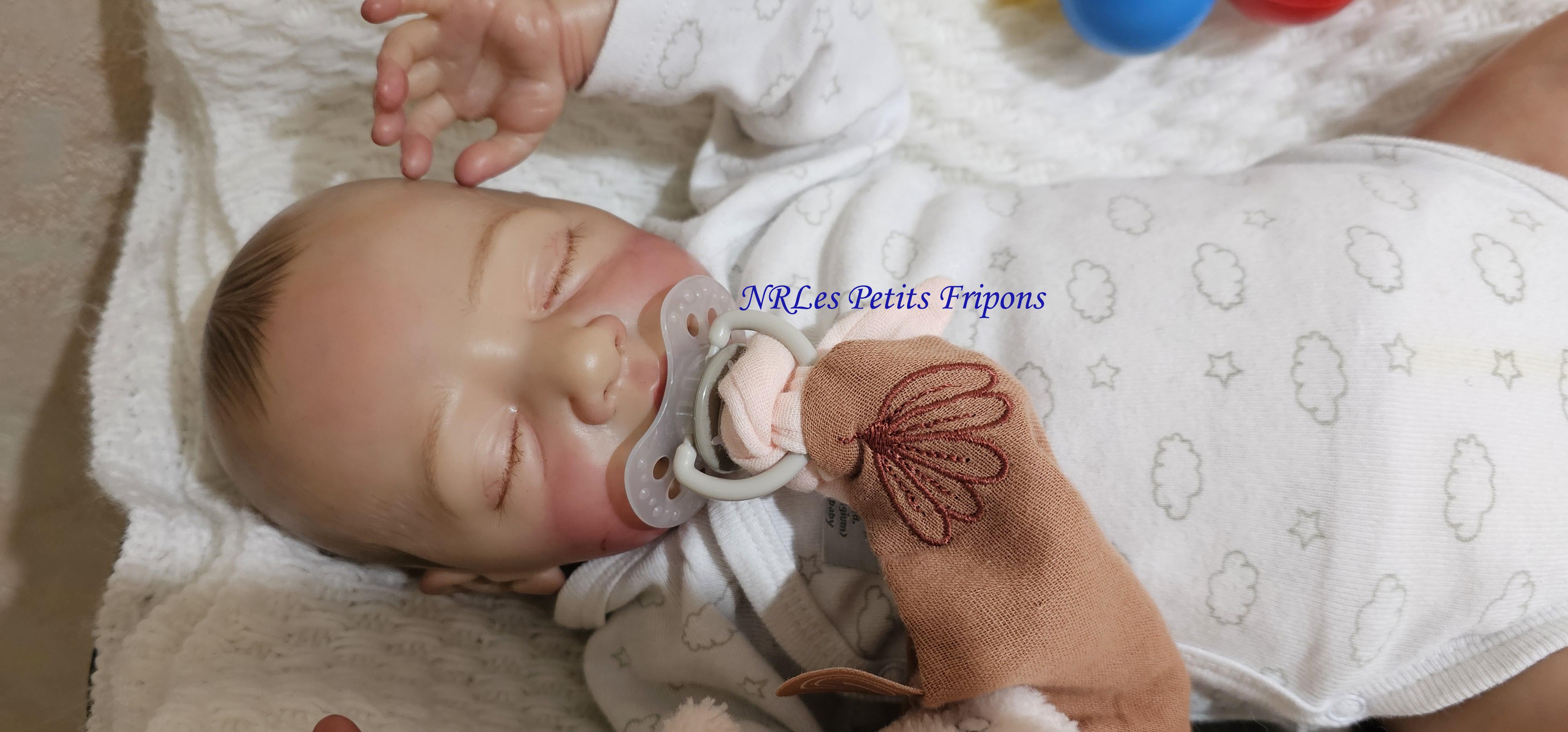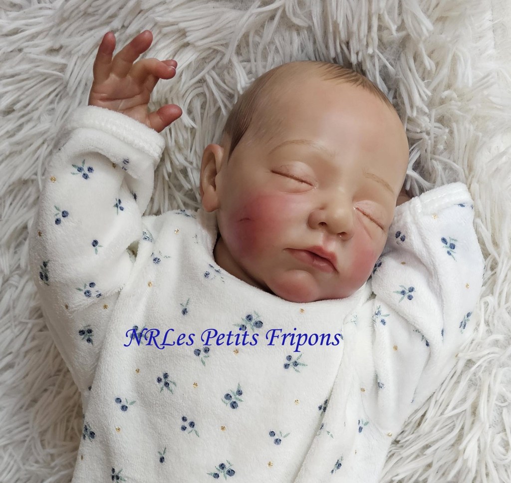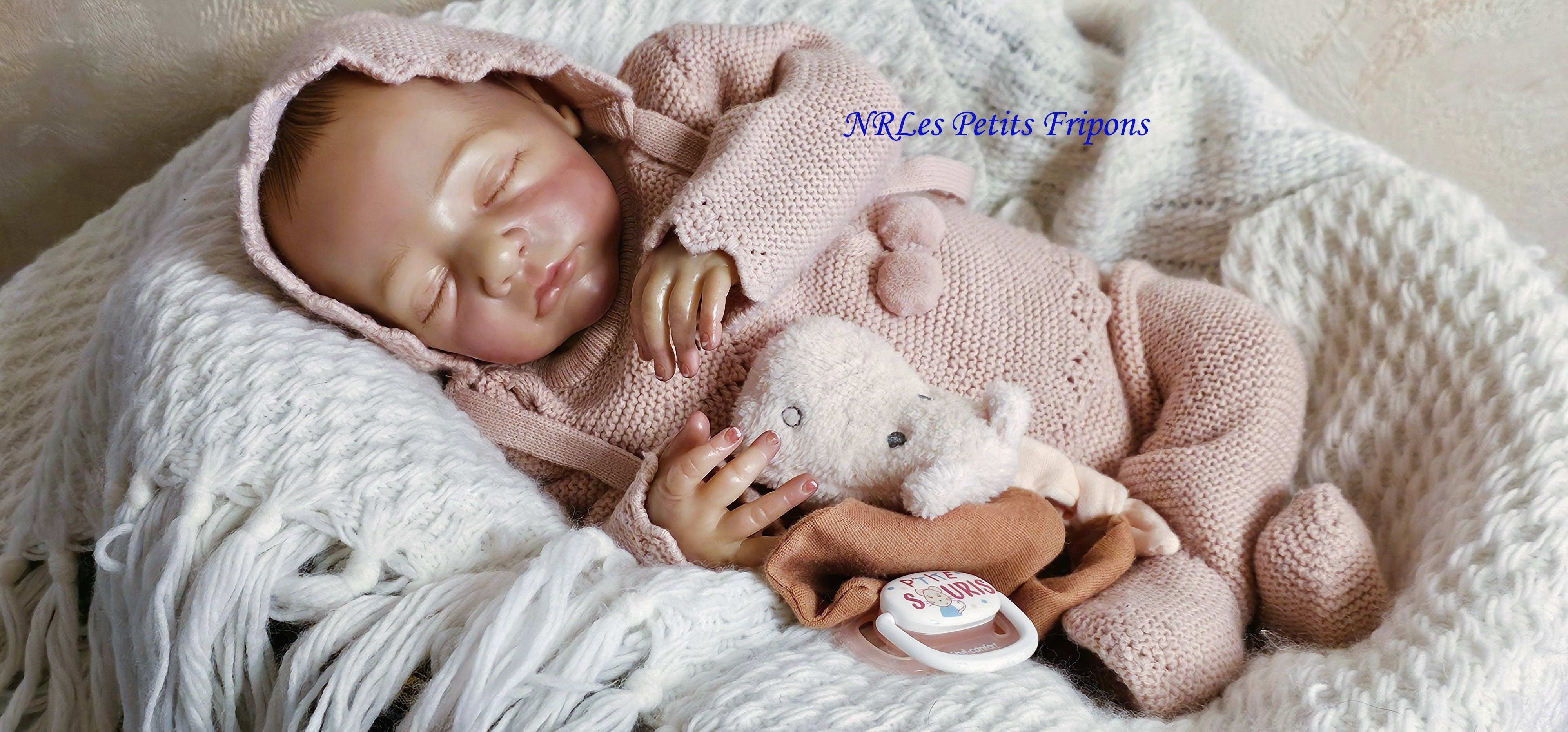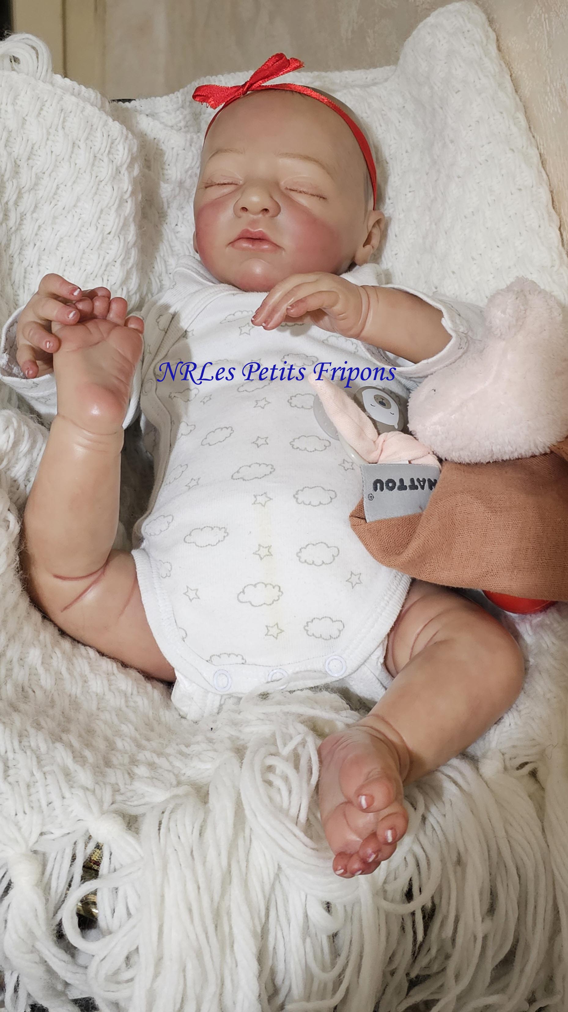 Estelle a un petit teint mat, le ventre en tissu et les membres entiers en vinyle peint à l’acrylique Ultimate Fusion™ dans les règles du Reborning avec griffures, veines, ongles, tête qui tombe en arrière, hair painting, cils en Mohair de marque Susan Nagel et sourcils peints. Estelle est vernis (mat) 3 couches