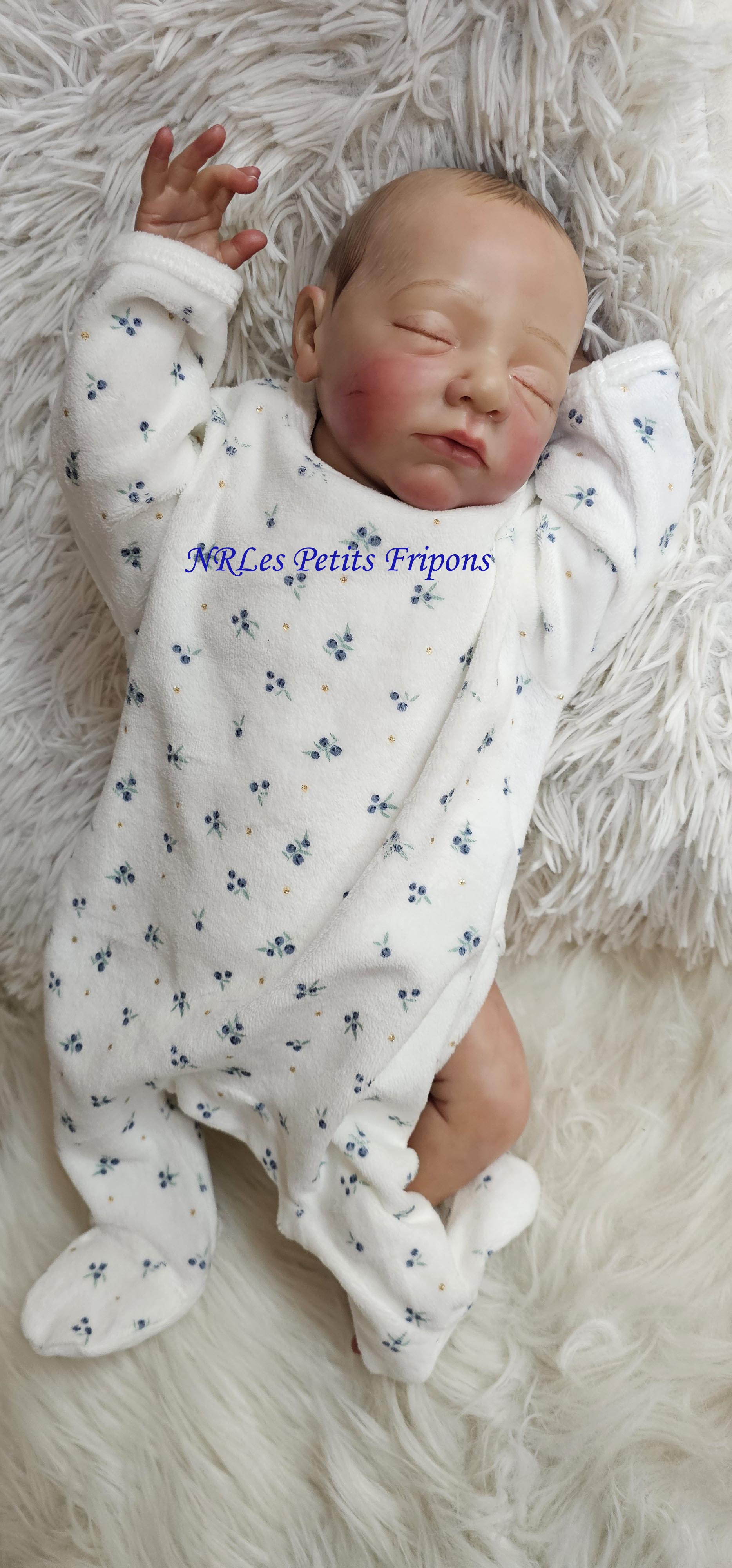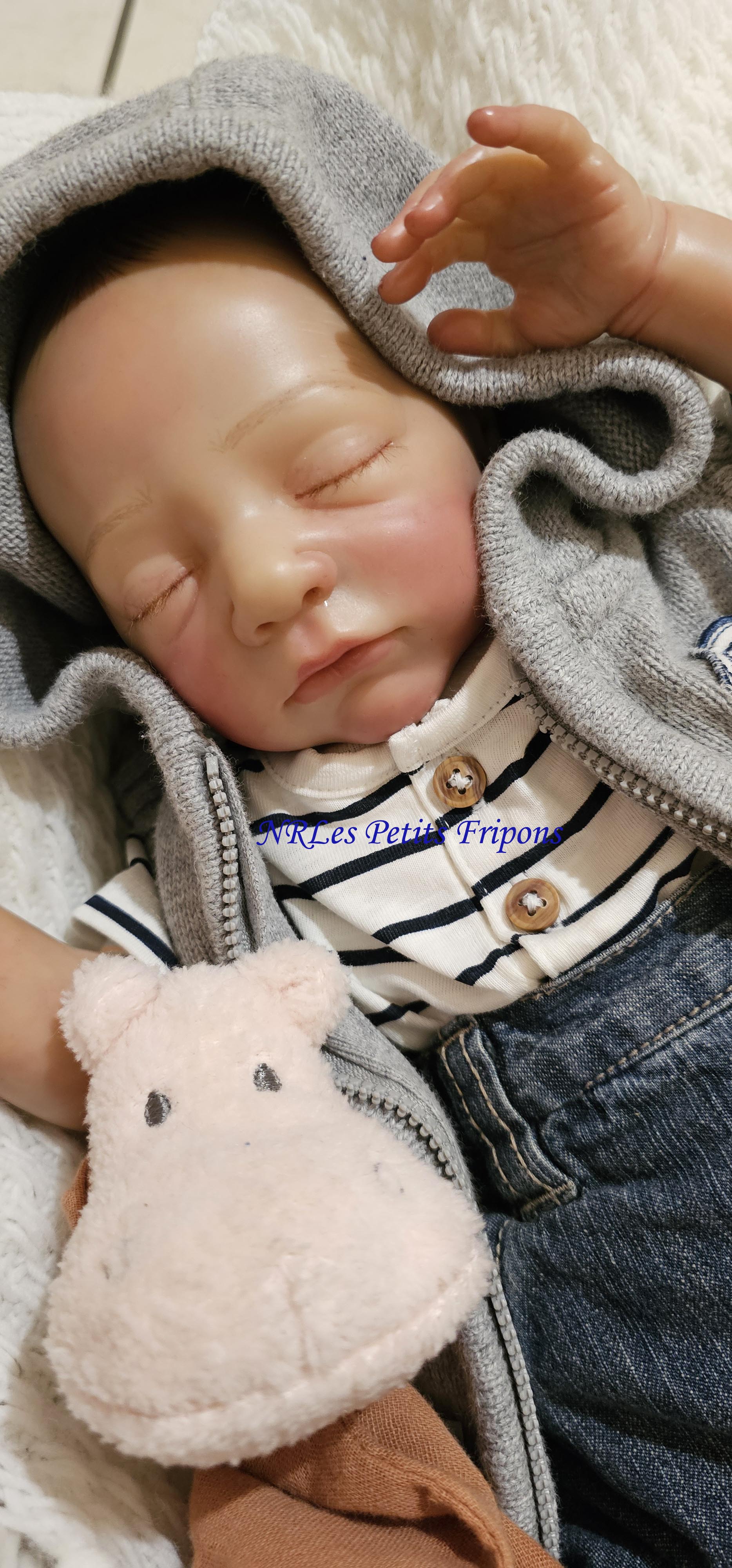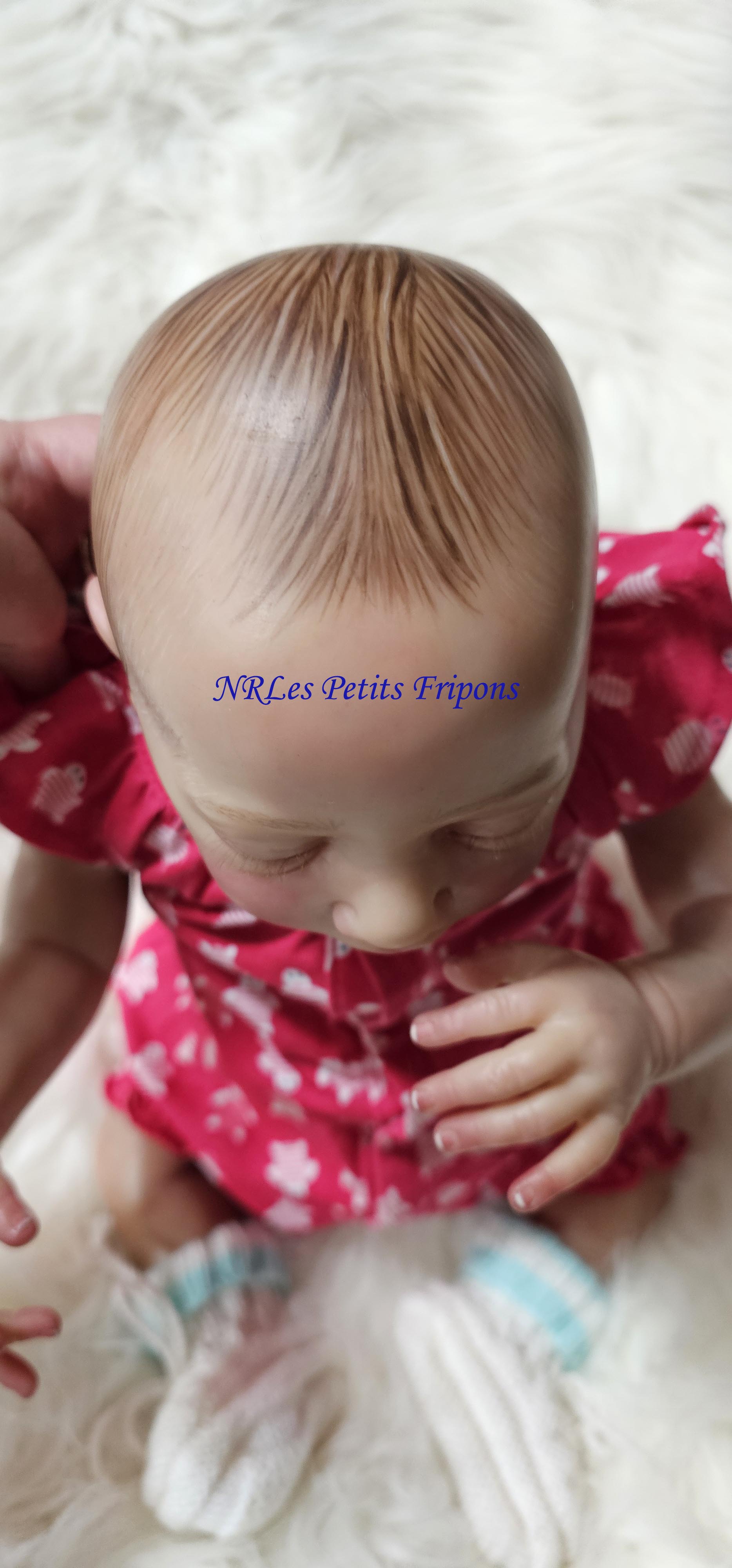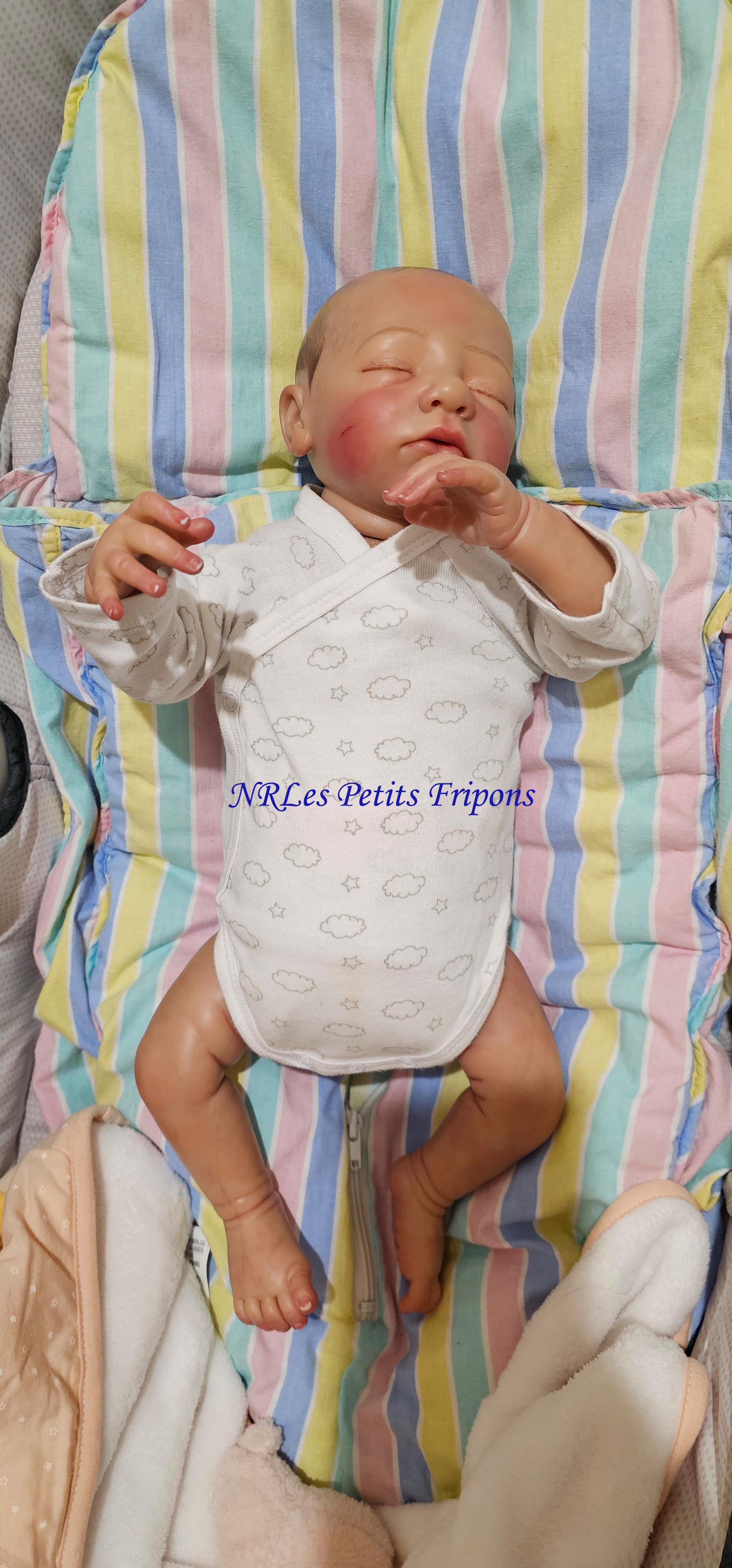 Estelle a un petit teint mat, le ventre en tissu et les membres entiers en vinyle peint à l’acrylique Ultimate Fusion™ dans les règles du Reborning avec griffures, veines, ongles, tête qui tombe en arrière, hair painting, cils en Mohair de marque Susan Nagel et sourcils peints. Estelle est vernis (mat) 3 couches