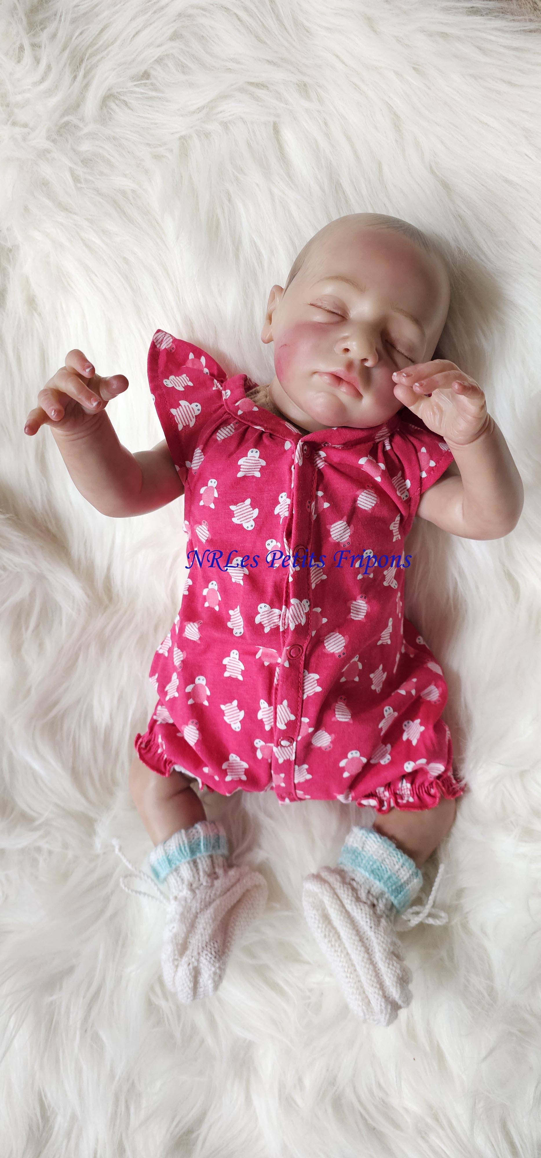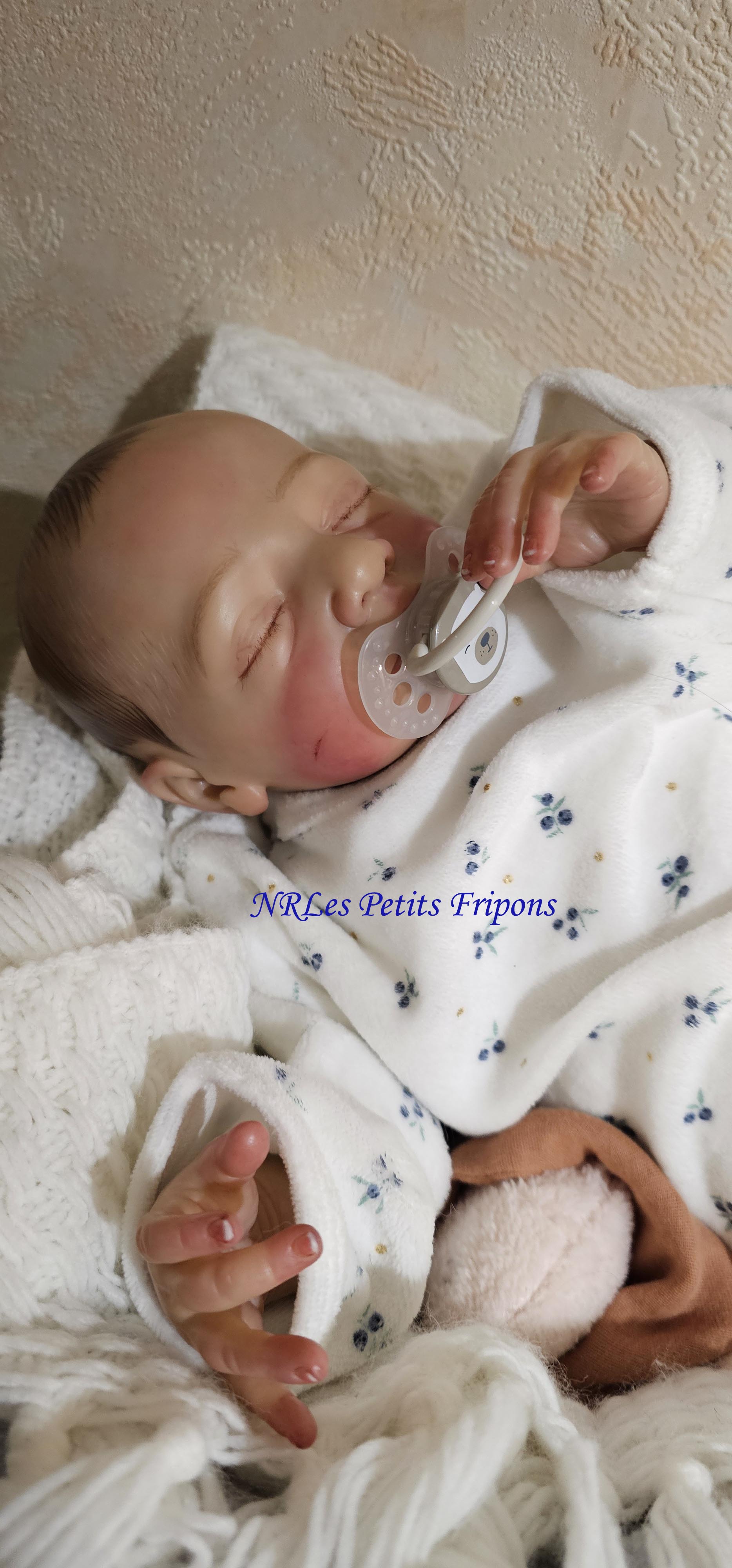 Estelle partira avec son trousseau (petit ou complet), son certificat de naissance, son bracelet de naissance, sa tétine aimantée et ses papiers d’authenticité de Boutik Reborn (Attention la tétine et la poupée sont aimantées donc soyez vigilants avec les personnes équipées d’un pacemaker)