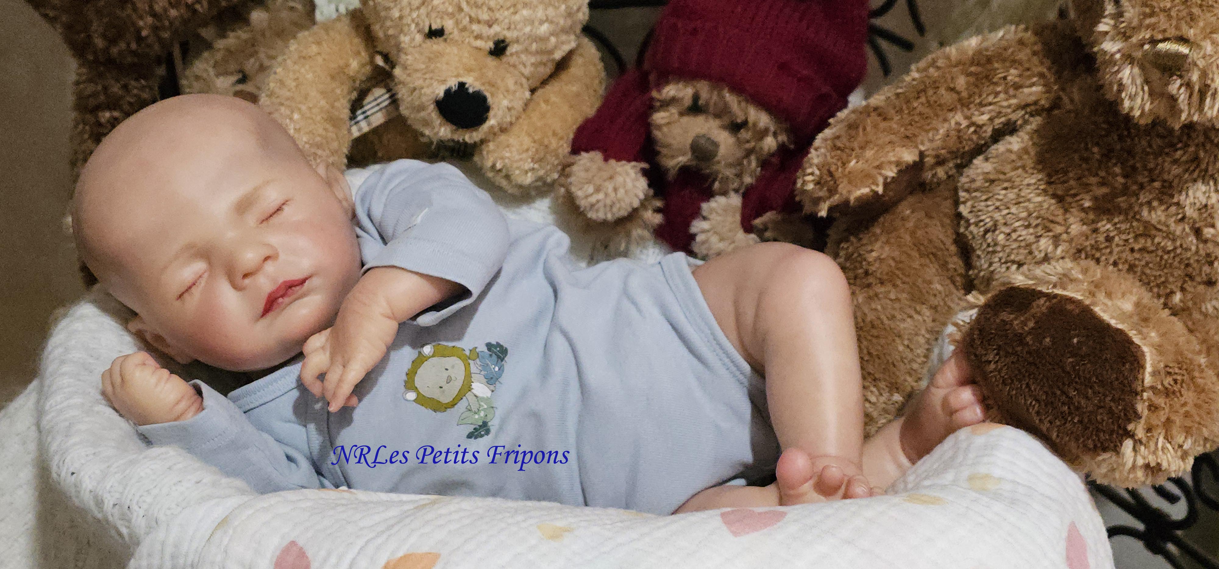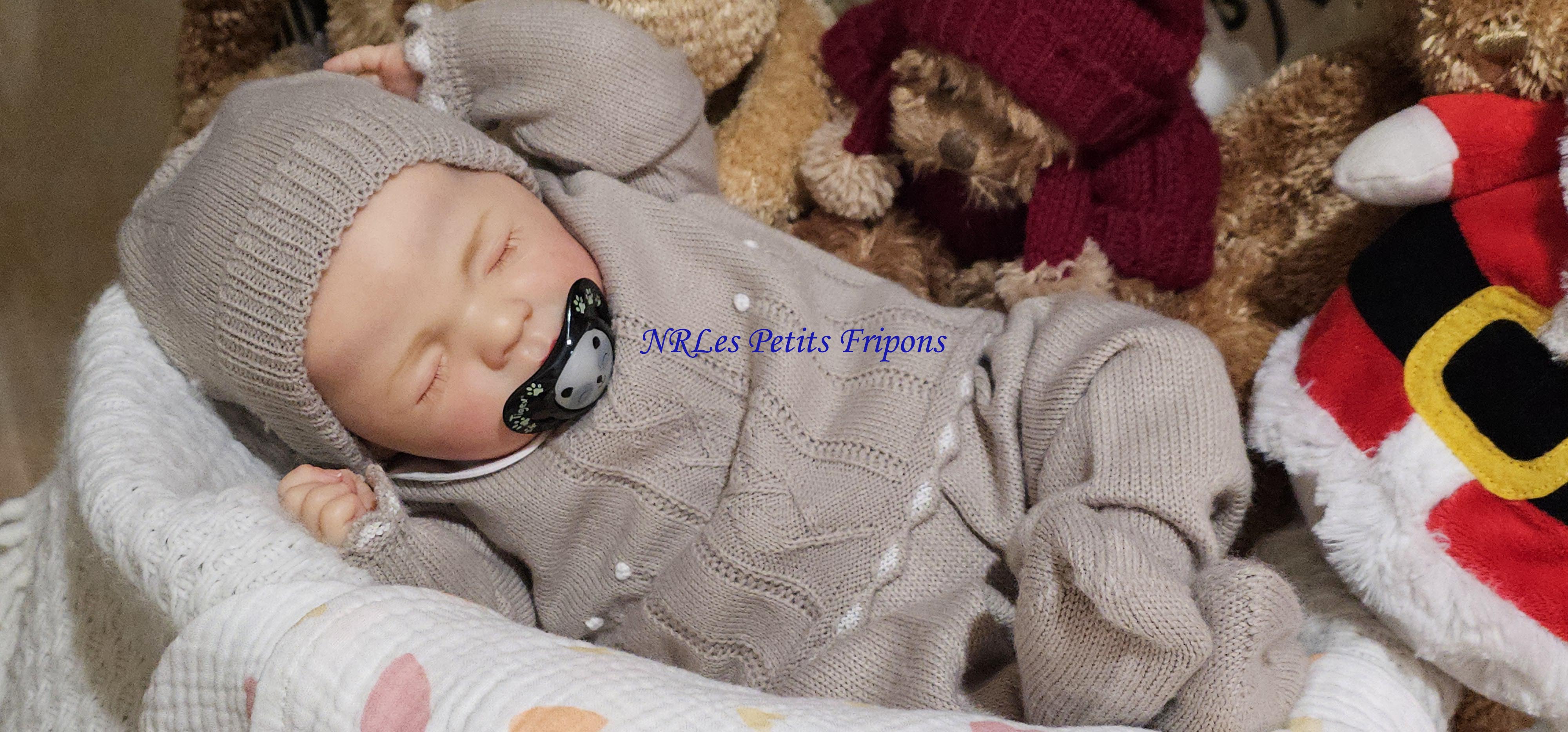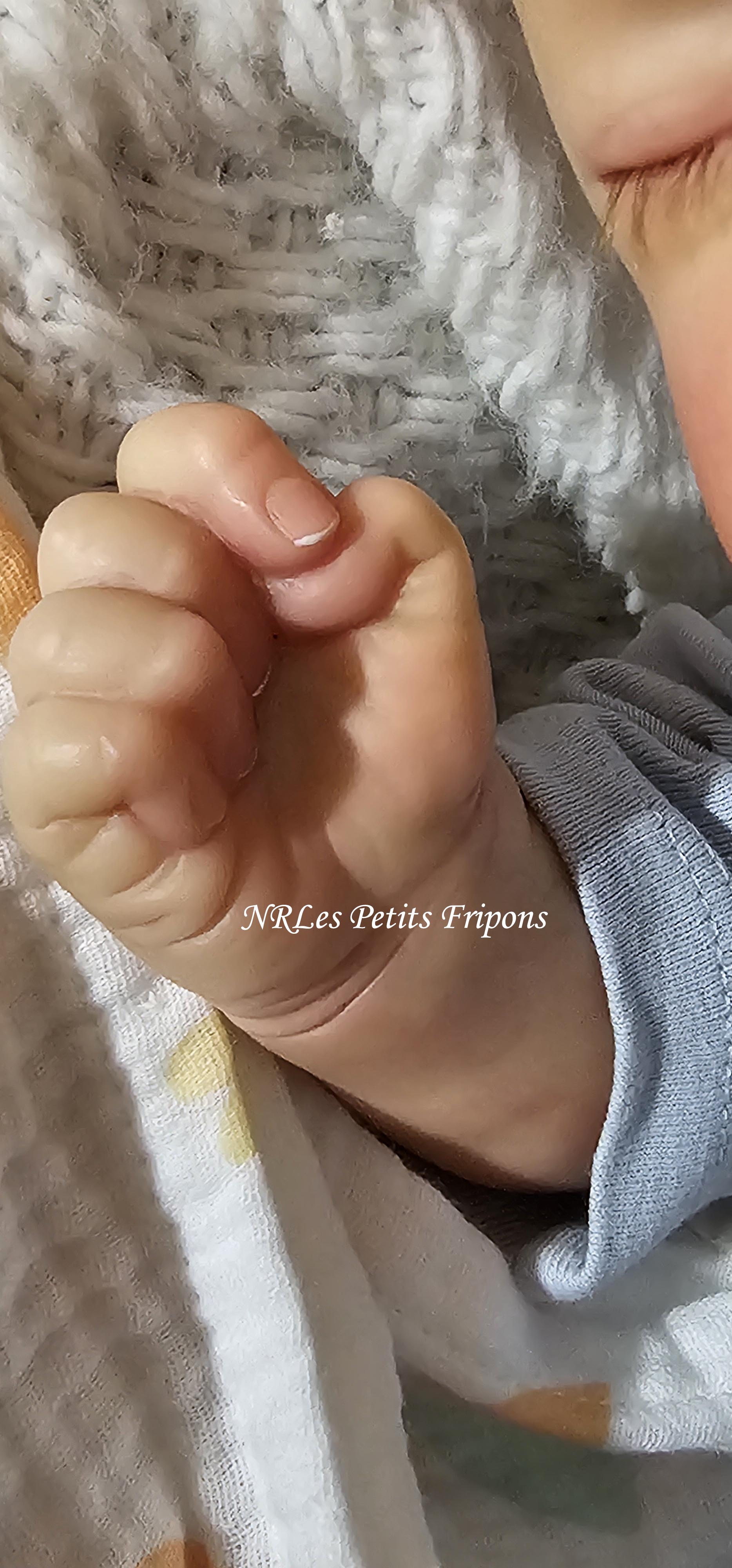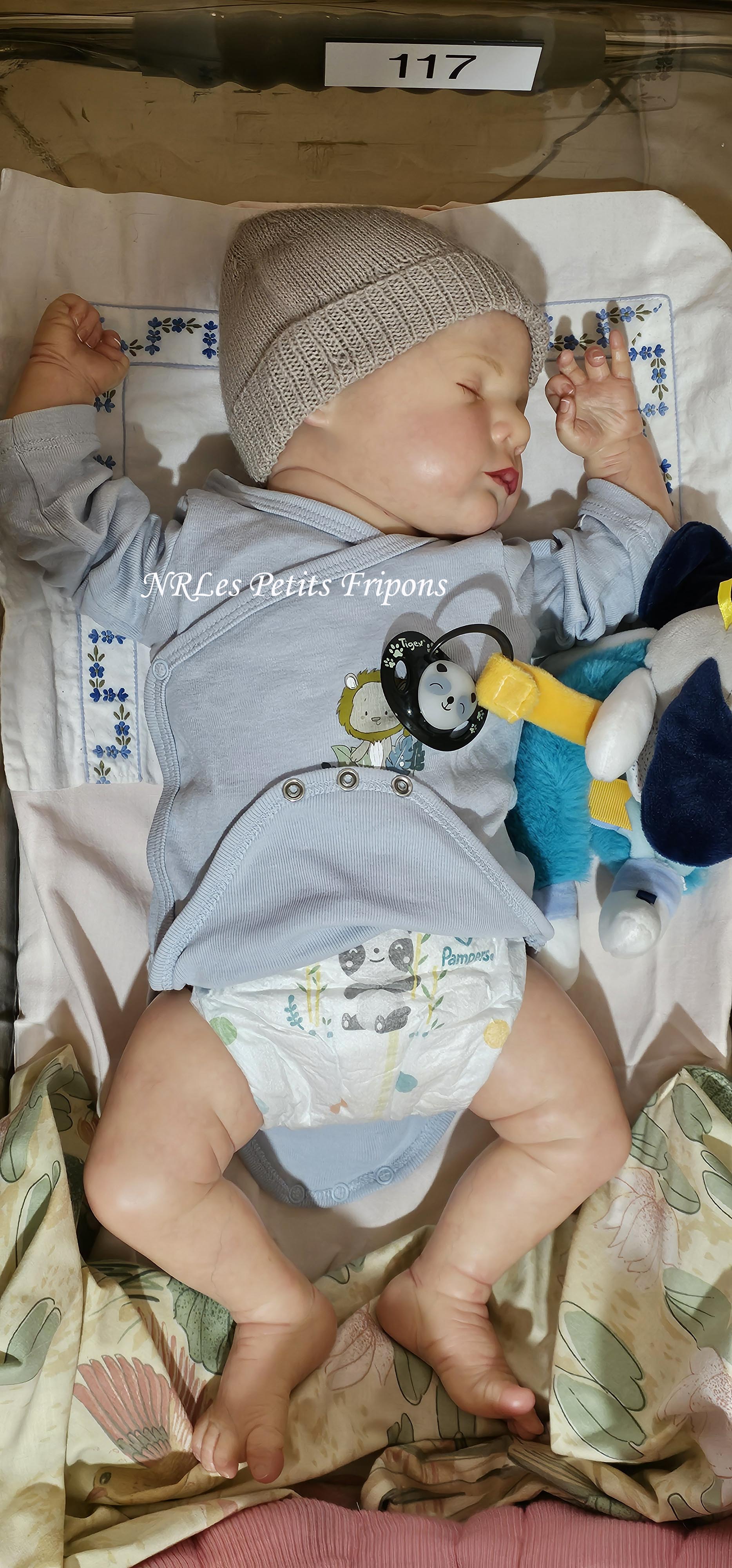 Diego a le teint clair, le ventre en tissu et les membres entiers en vinyle peint à l’acrylique Golden™ dans les règles du Reborning avec veines, ongles, tête qui tombe en arrière, cils en Mohair Susan Nagel et sourcils peints, des yeux fermés. Diego n’a pas de HP ni cheveux. Diego a 3 couches de vernis mat de finition. Il porte un aimant à la bouche (Attention la tétine et la poupée sont aimantées donc soyez vigilants avec les personnes équipées d’un pacemaker)