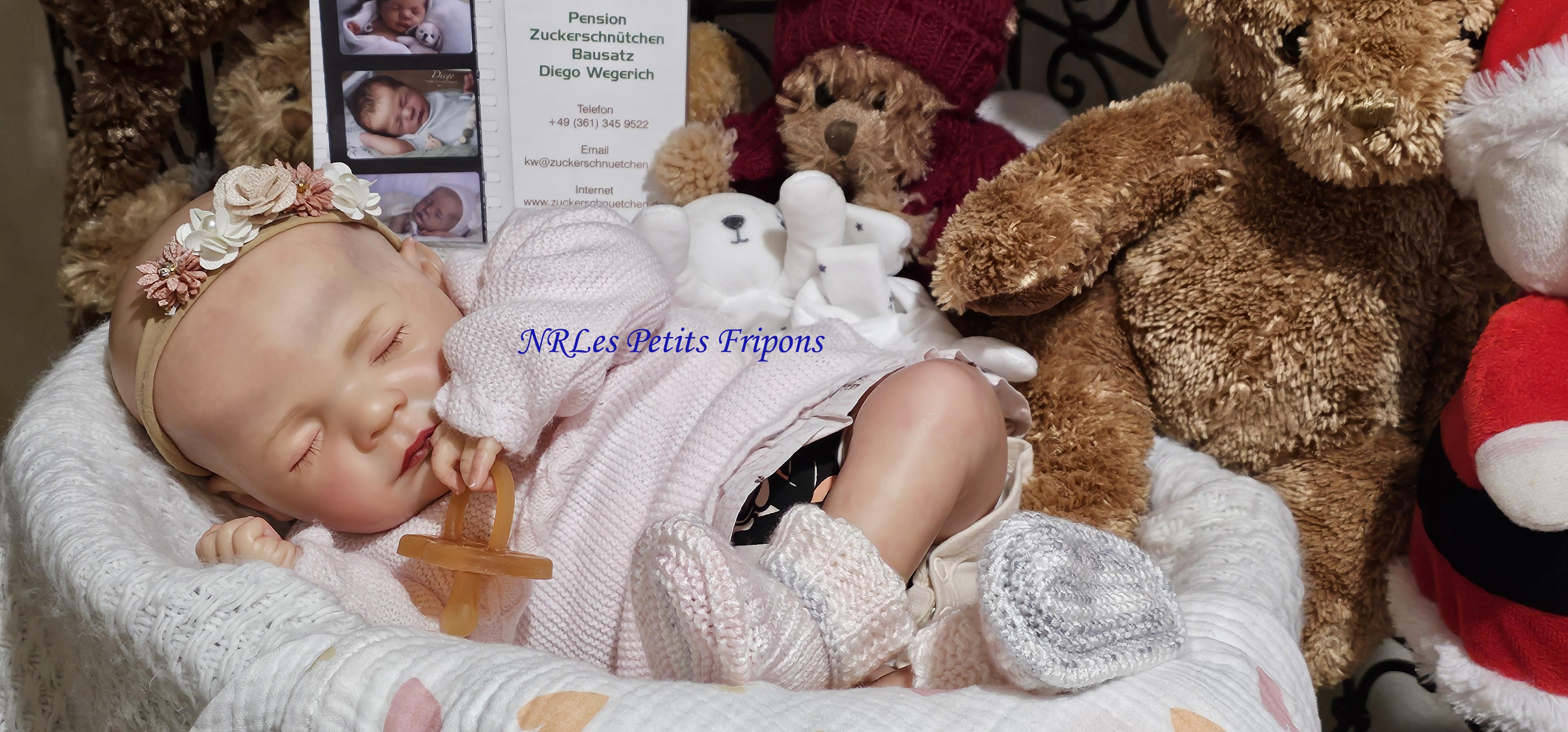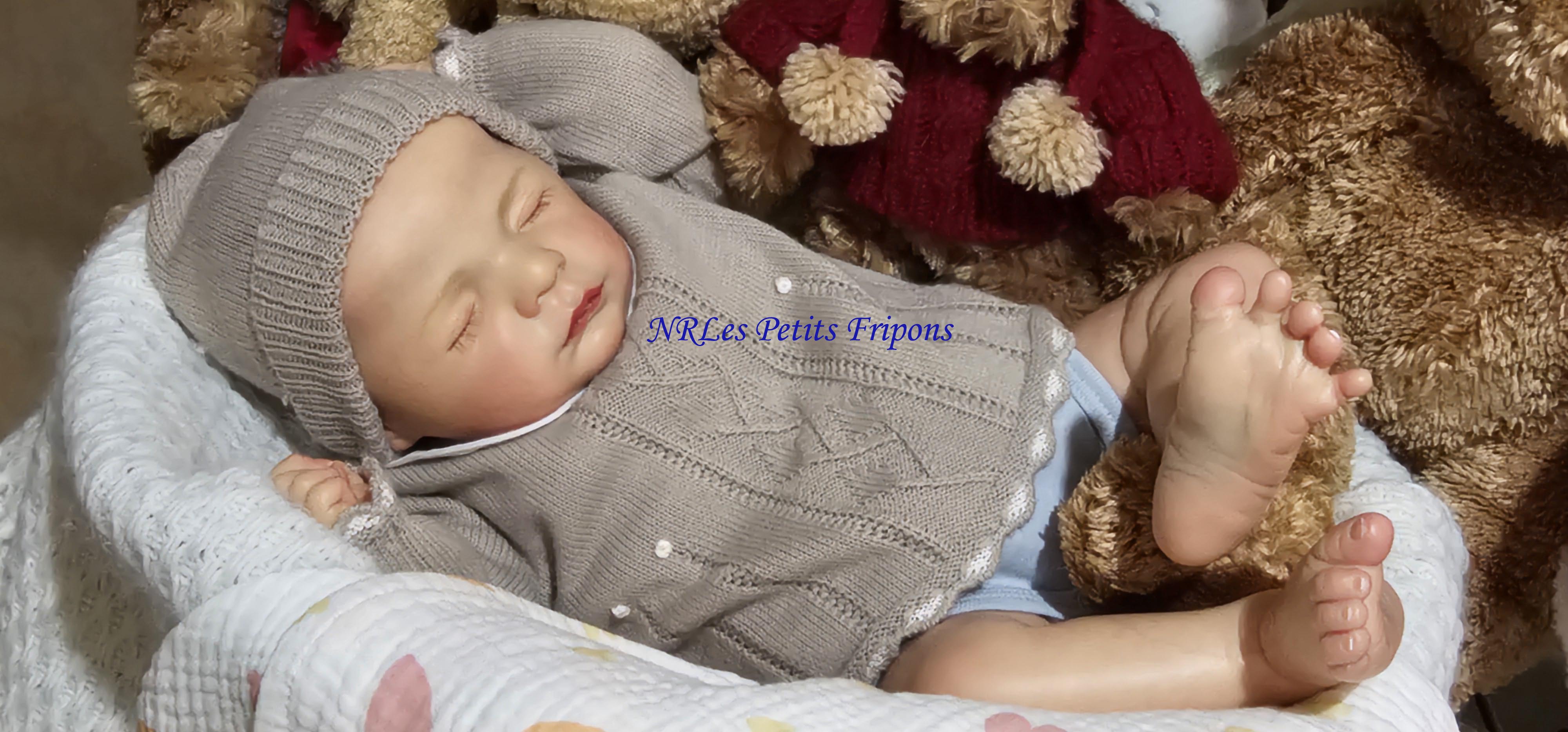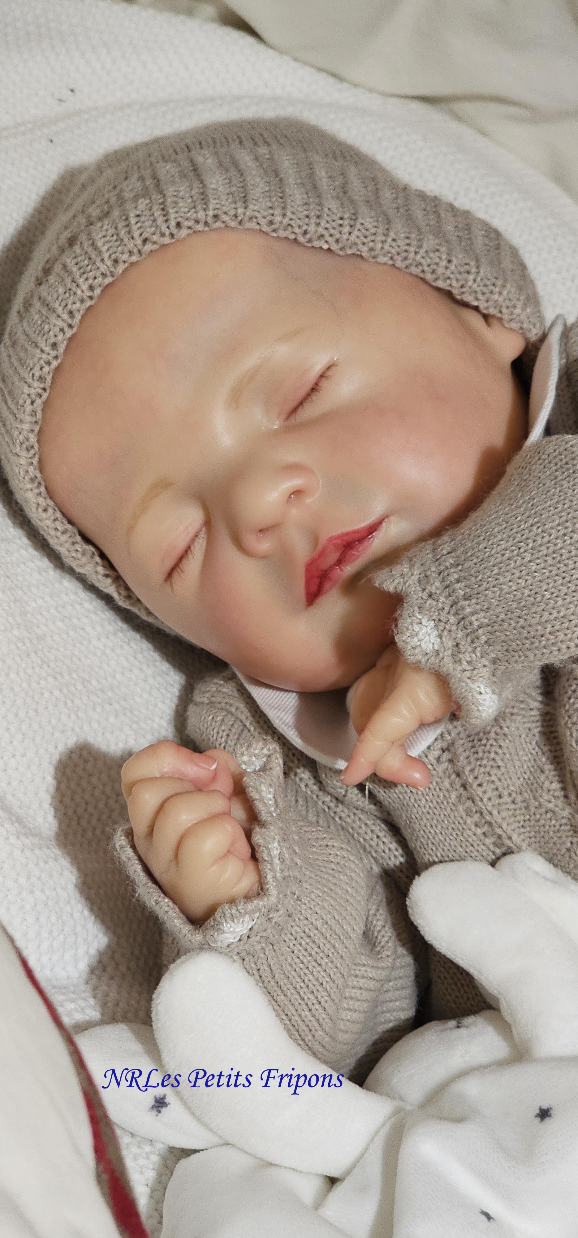 Diego a le teint clair, le ventre en tissu et les membres entiers en vinyle peint à l’acrylique Golden™ dans les règles du Reborning avec veines, ongles, tête qui tombe en arrière, cils en Mohair Susan Nagel et sourcils peints, des yeux fermés. Diego n’a pas de HP ni cheveux. Diego a 3 couches de vernis mat de finition. Il porte un aimant à la bouche (Attention la tétine et la poupée sont aimantées donc soyez vigilants avec les personnes équipées d’un pacemaker)