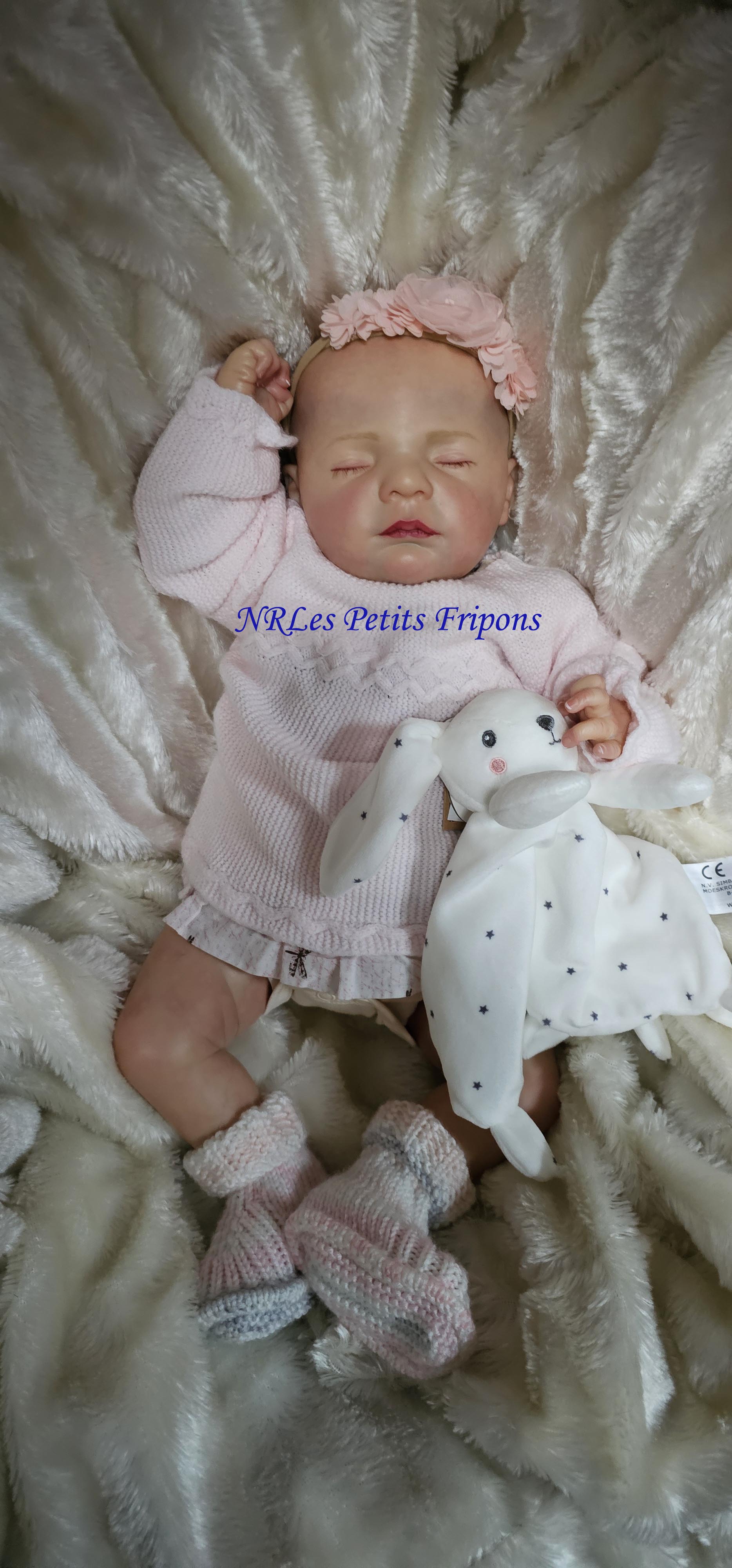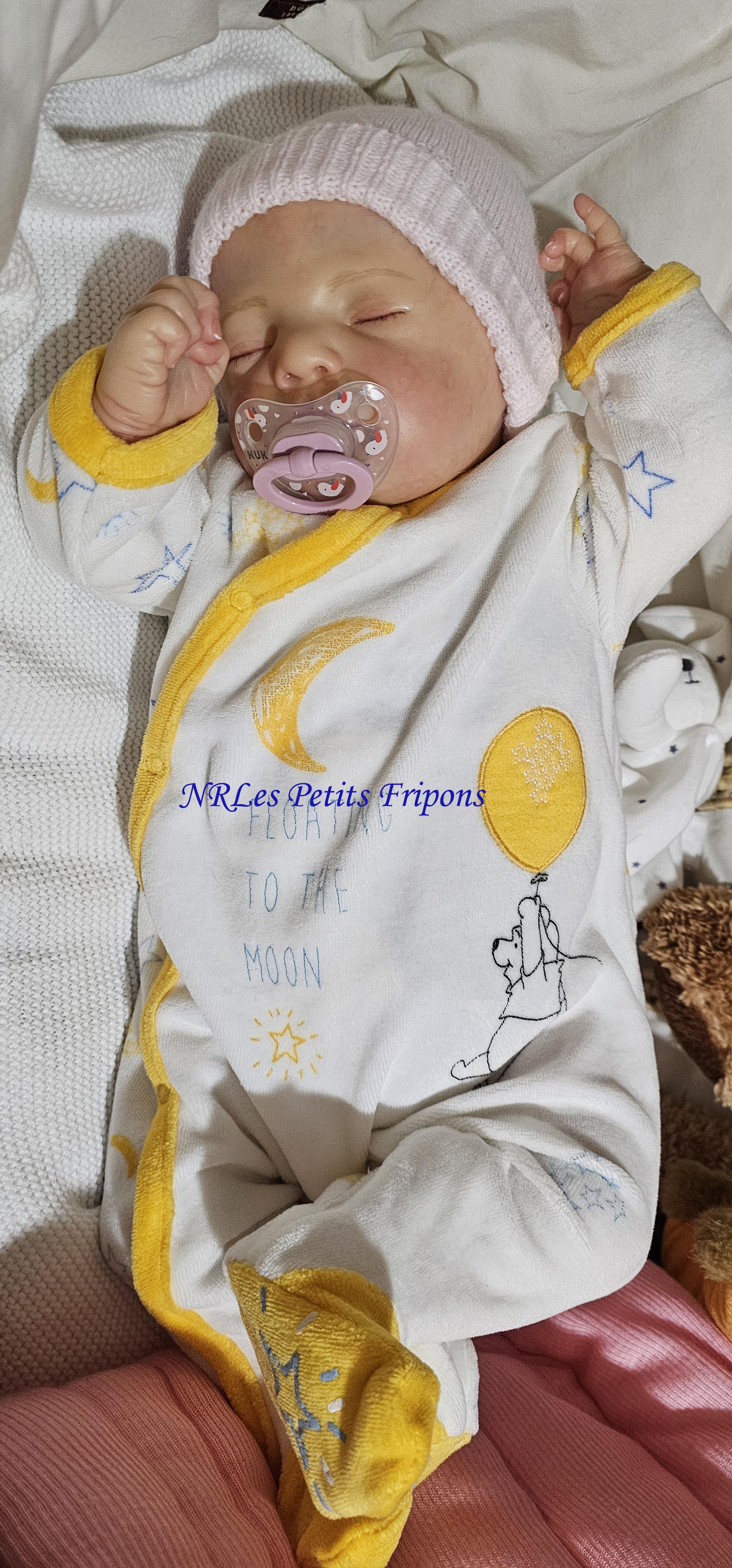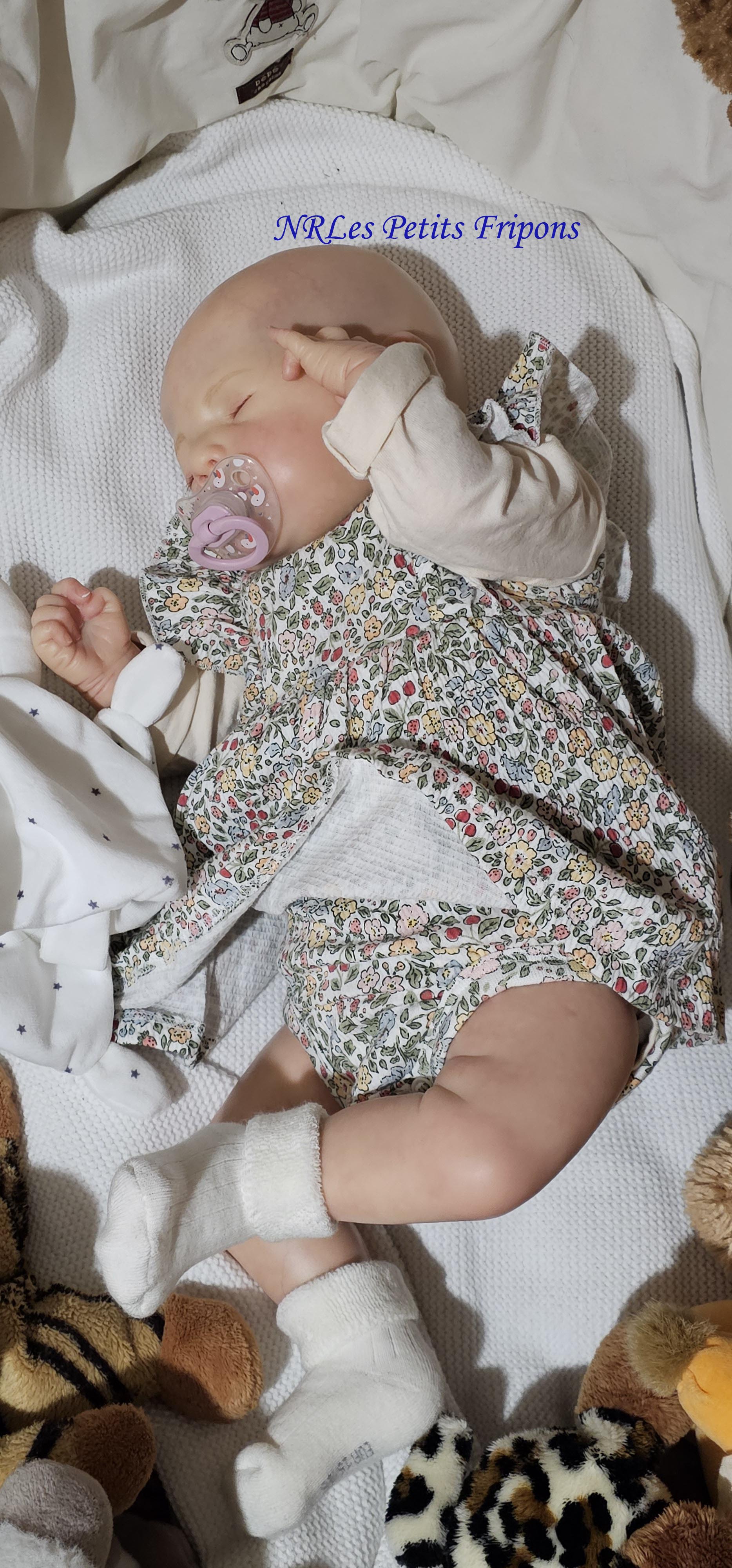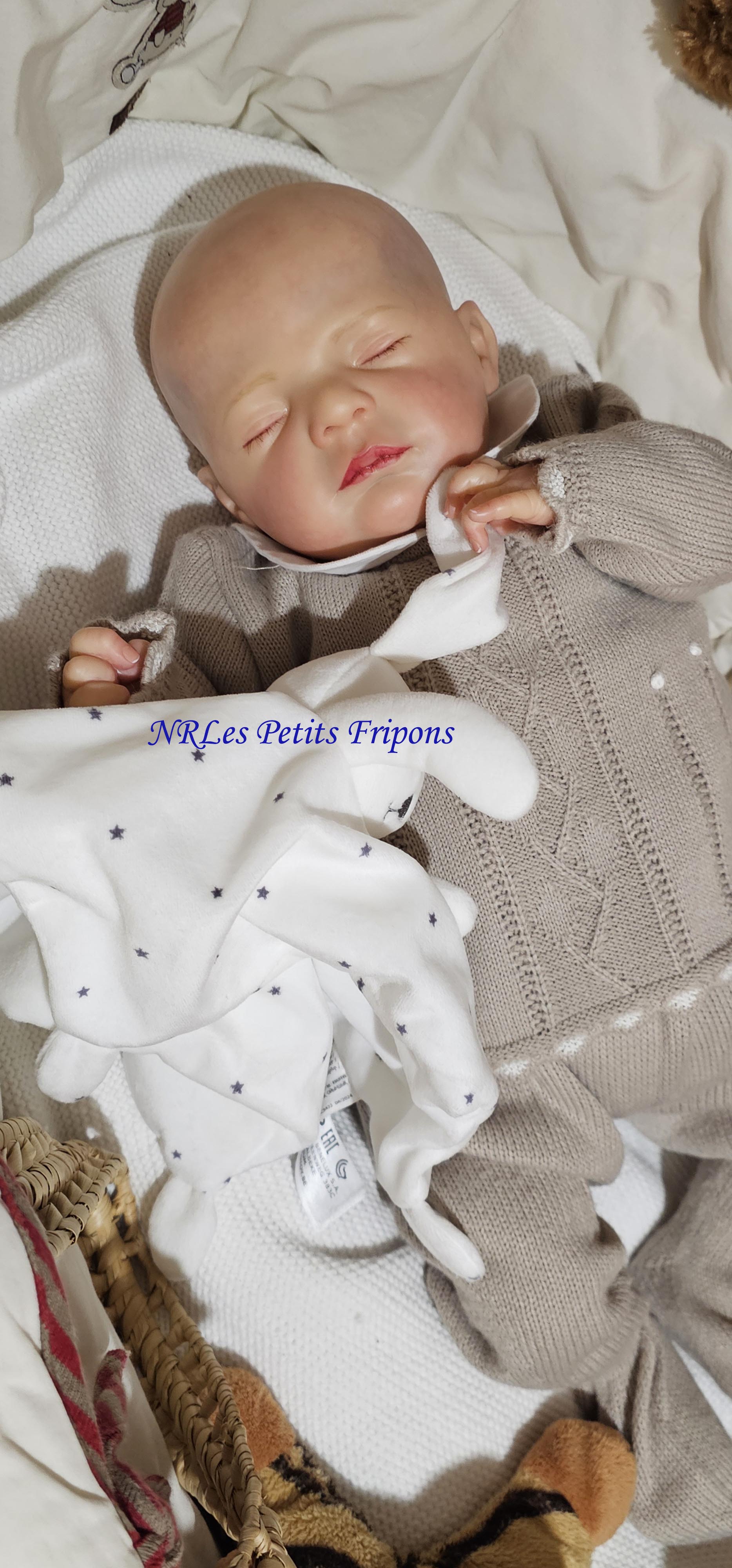 Diego a le teint clair, le ventre en tissu et les membres entiers en vinyle peint à l’acrylique Golden™ dans les règles du Reborning avec veines, ongles, tête qui tombe en arrière, cils en Mohair Susan Nagel et sourcils peints, des yeux fermés. Diego n’a pas de HP ni cheveux. Diego a 3 couches de vernis mat de finition. Il porte un aimant à la bouche (Attention la tétine et la poupée sont aimantées donc soyez vigilants avec les personnes équipées d’un pacemaker)