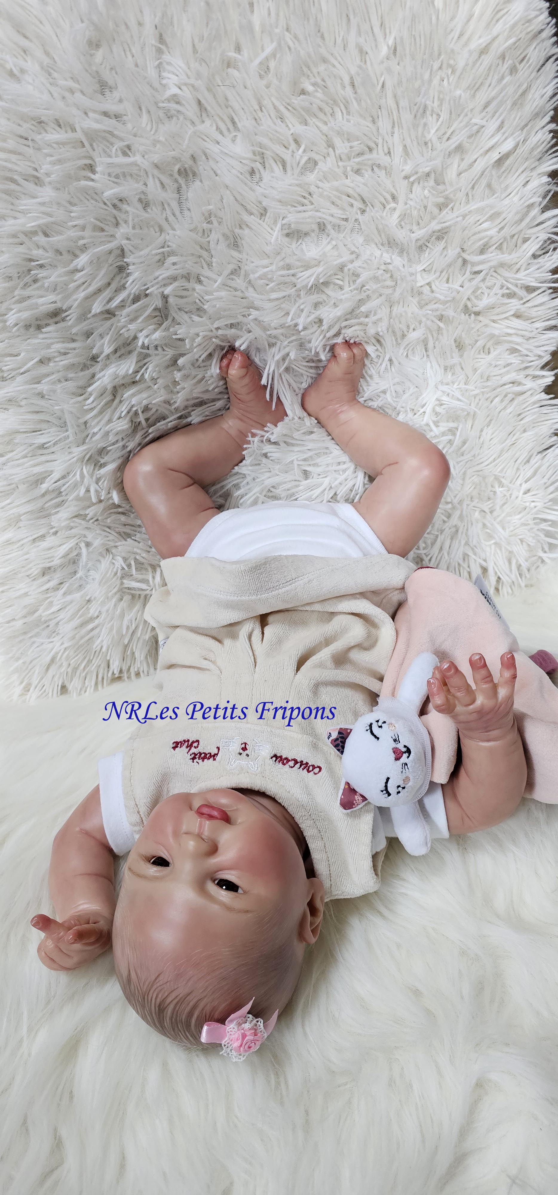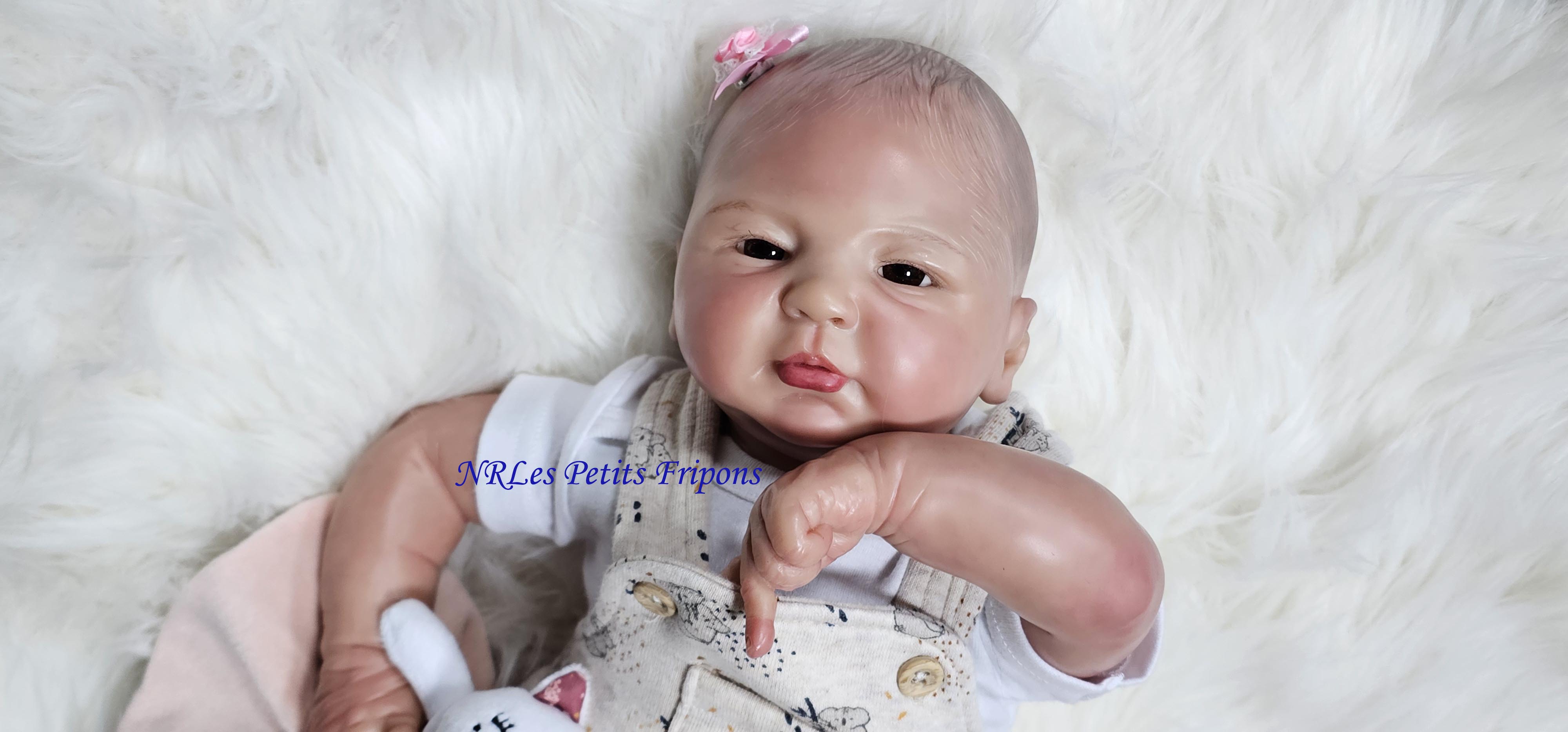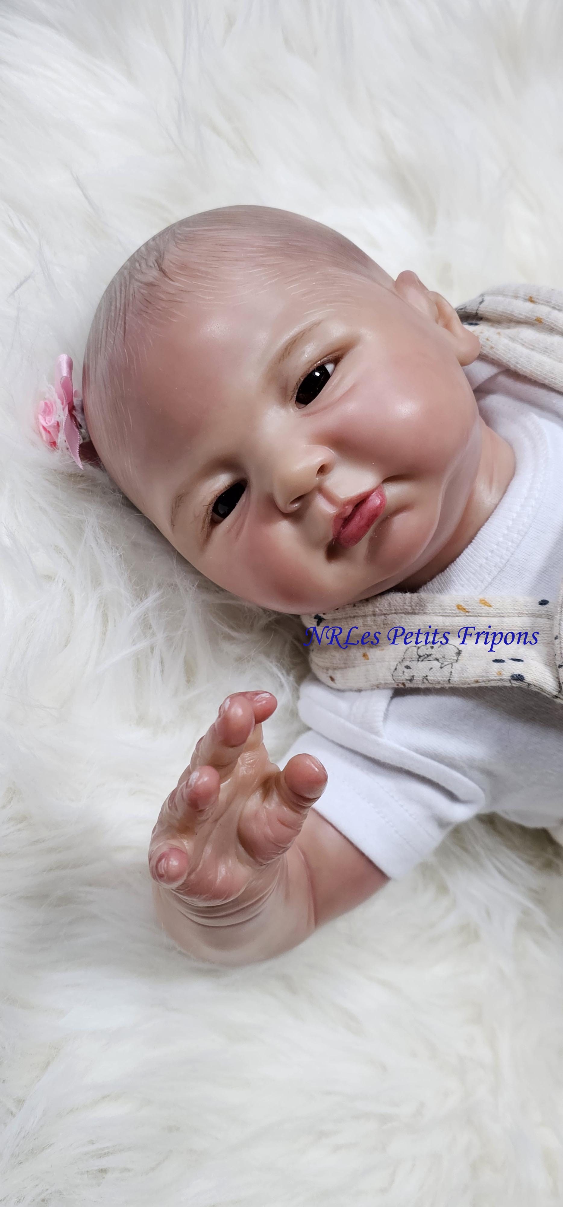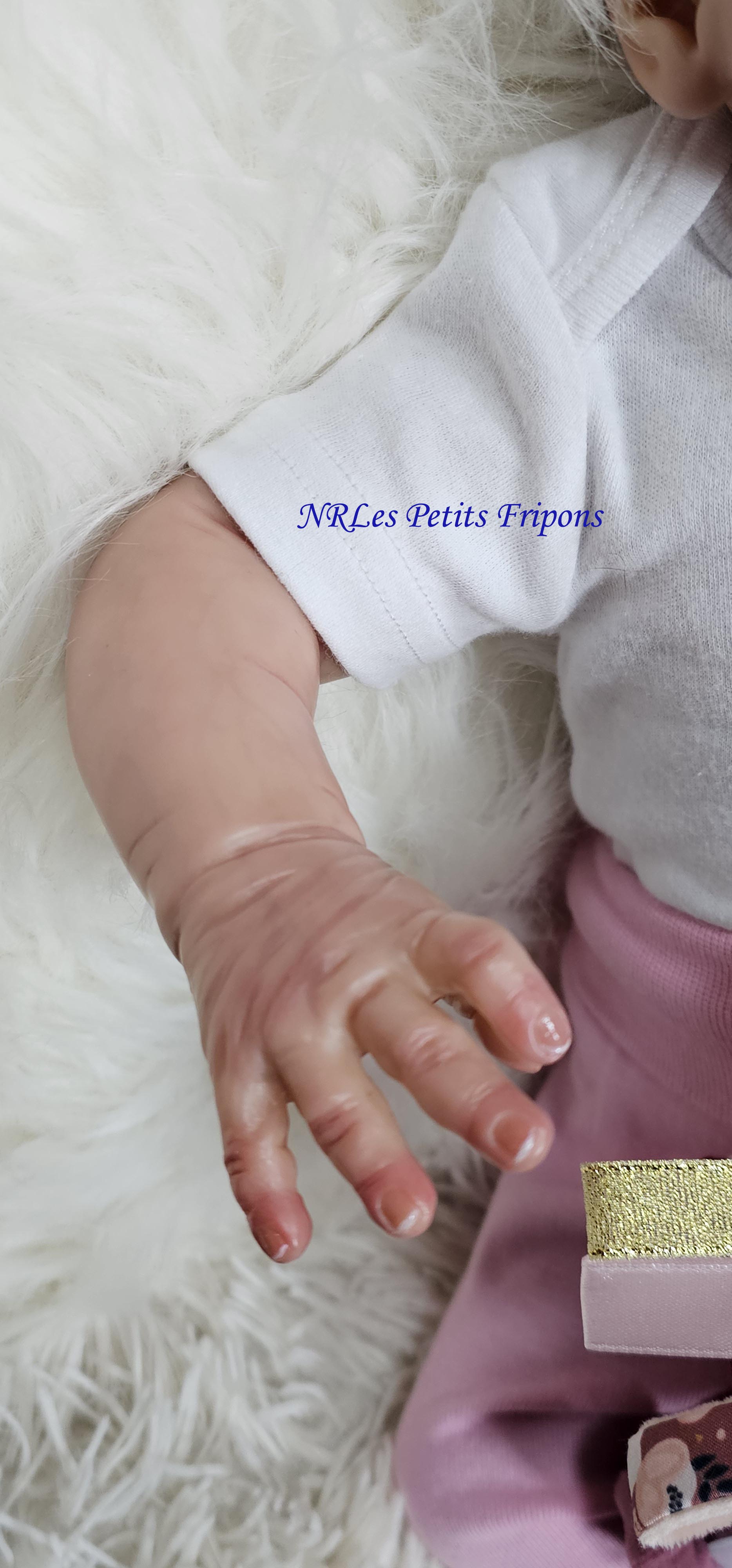 Majara a un petit teint mat, le ventre en tissu et les membres entiers en vinyle peint à l’acrylique Ultimate Fusion™ dans les règles du Reborning avec griffures, veines, ongles, tête qui tombe en arrière, hair painting, cils en Mohair Susan Nagel et sourcils peints, des yeux en verre marron. Majara a 3 couches de vernis mat de finition.Elle porte un aimant à la bouche et sur le côté droit de la tête