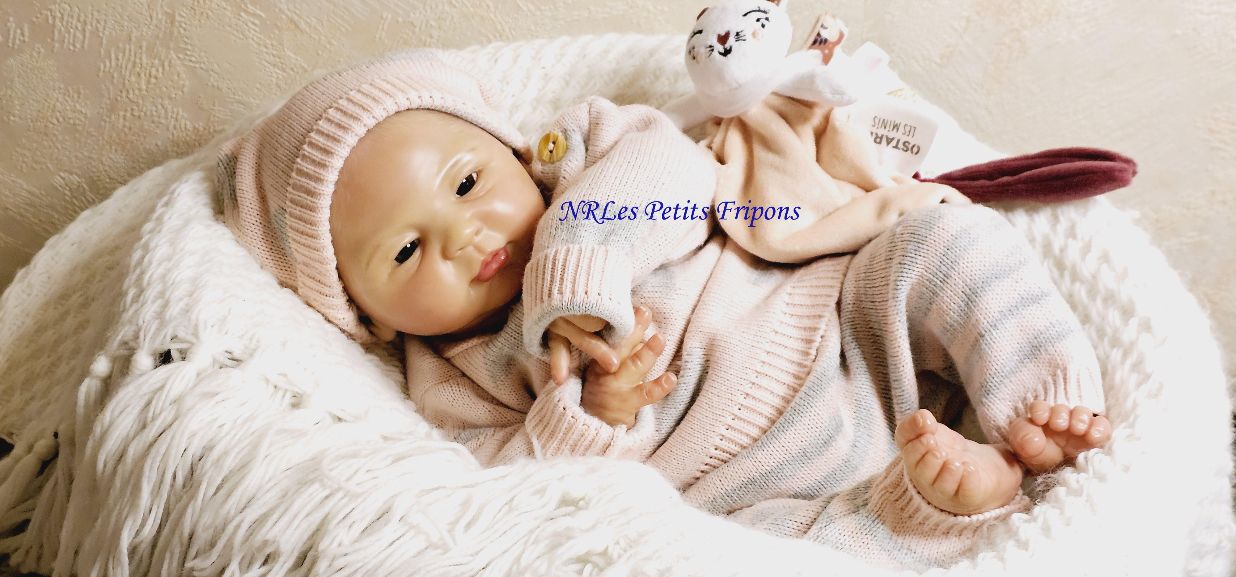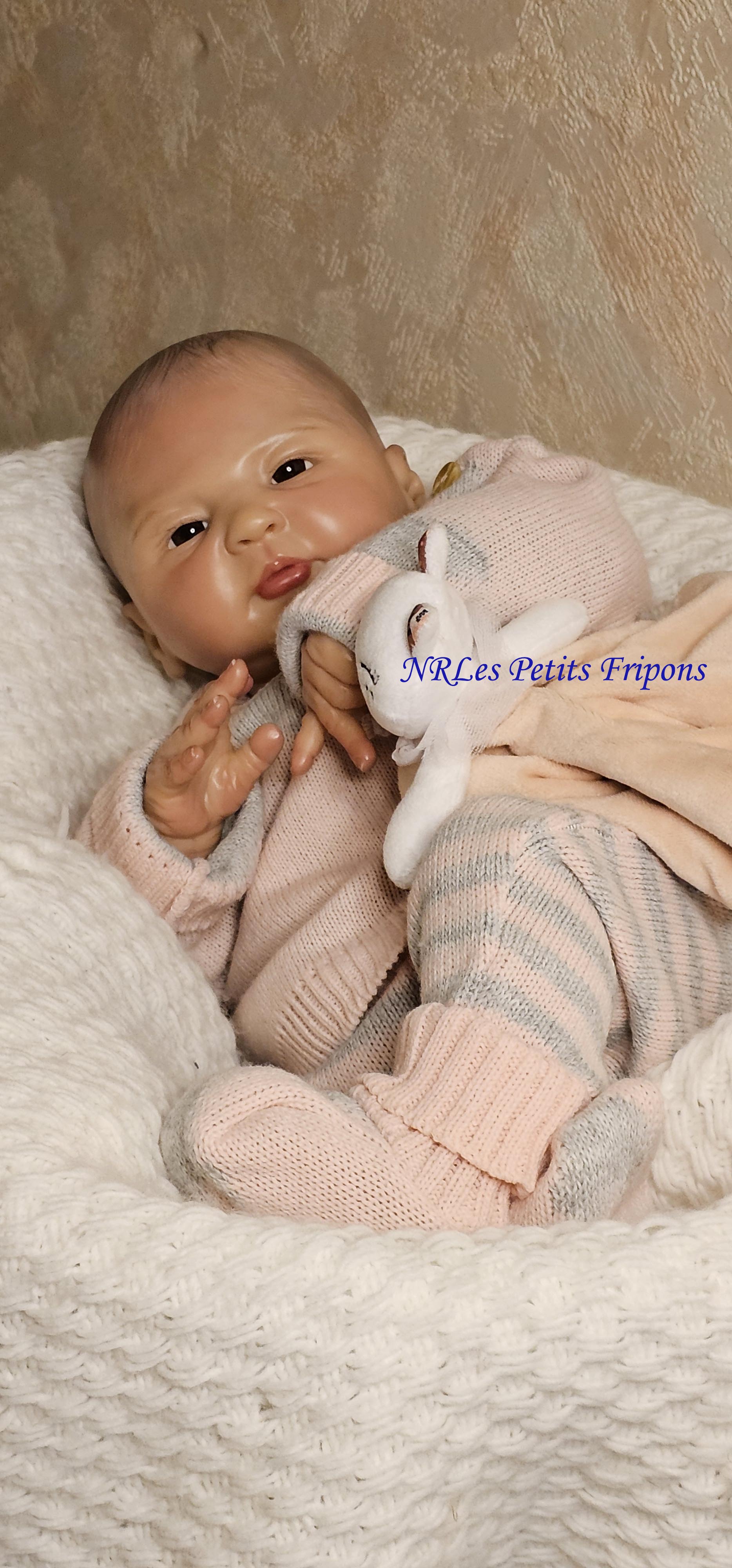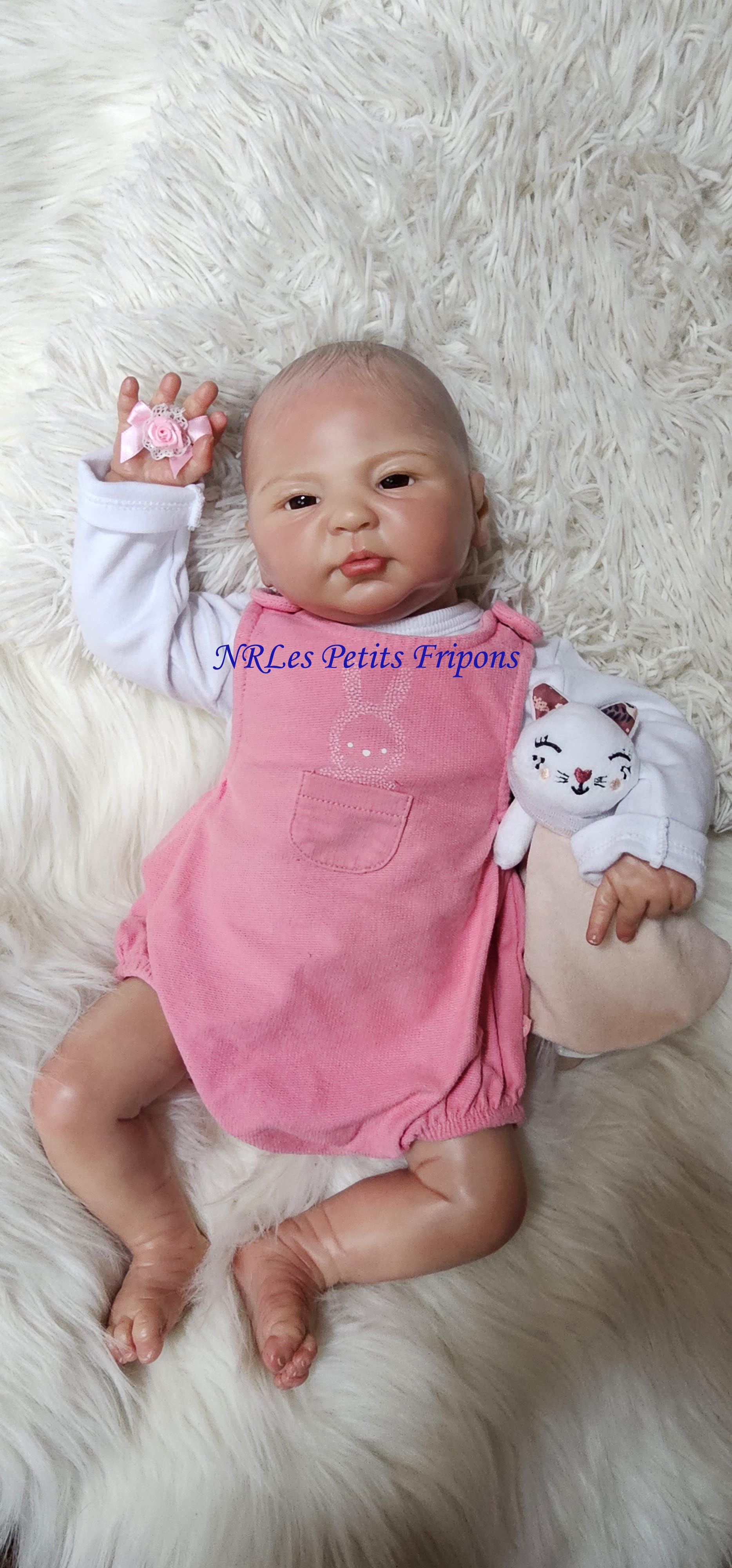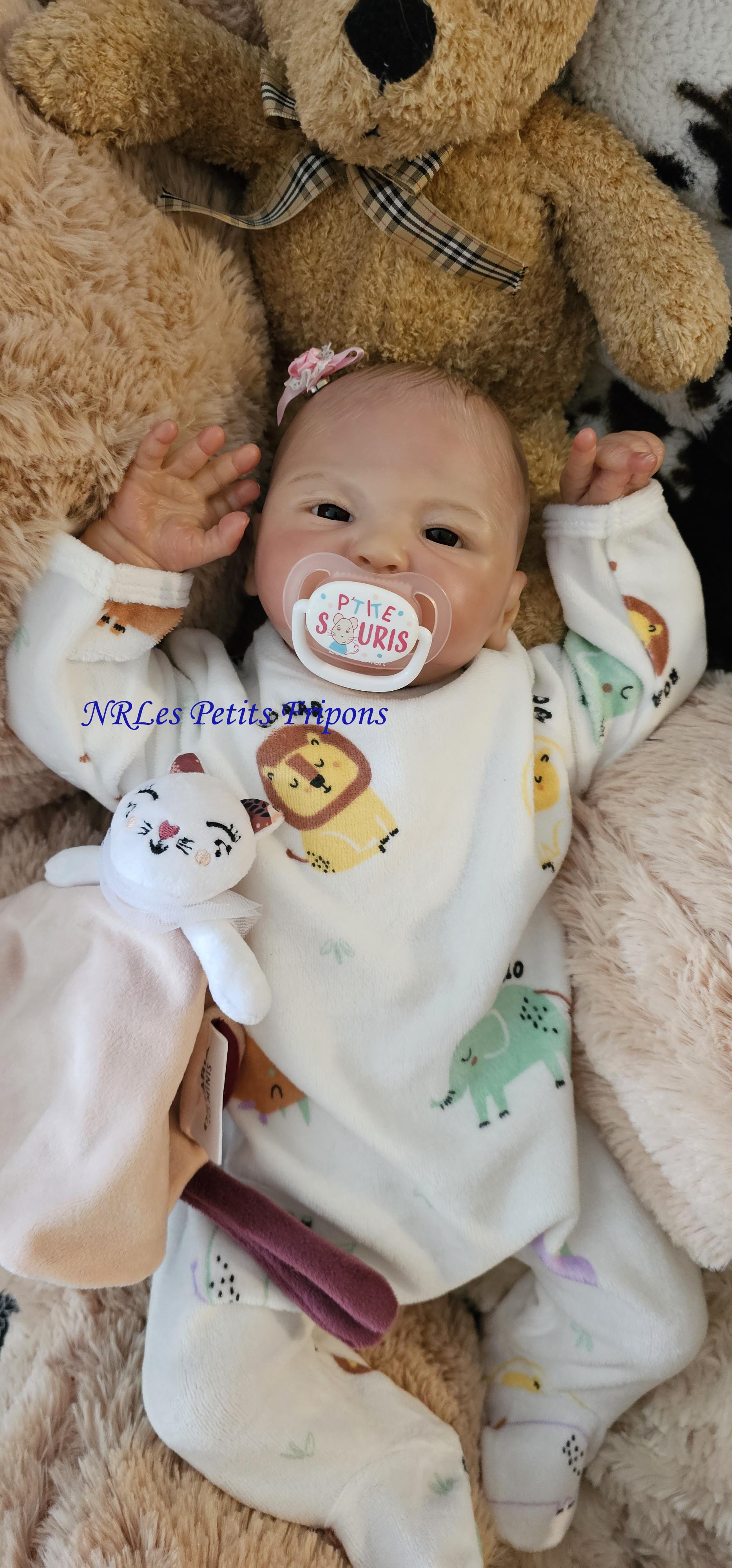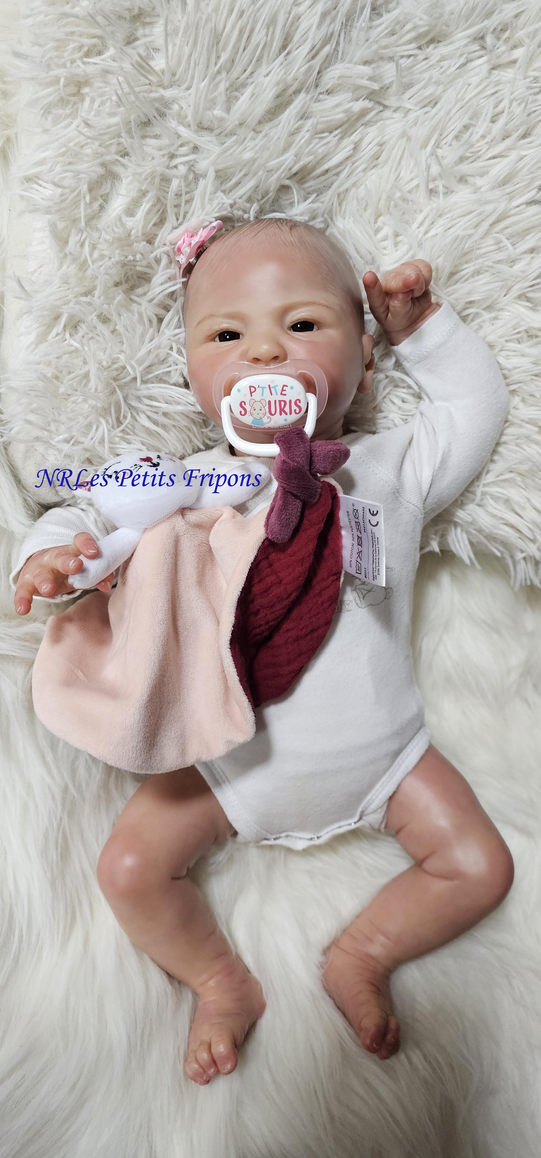 Majara a un petit teint mat, le ventre en tissu et les membres entiers en vinyle peint à l’acrylique Ultimate Fusion™ dans les règles du Reborning avec griffures, veines, ongles, tête qui tombe en arrière, hair painting, cils en Mohair Susan Nagel et sourcils peints, des yeux en verre marron. Majara a 3 couches de vernis mat de finition.Elle porte un aimant à la bouche et sur le côté droit de la tête