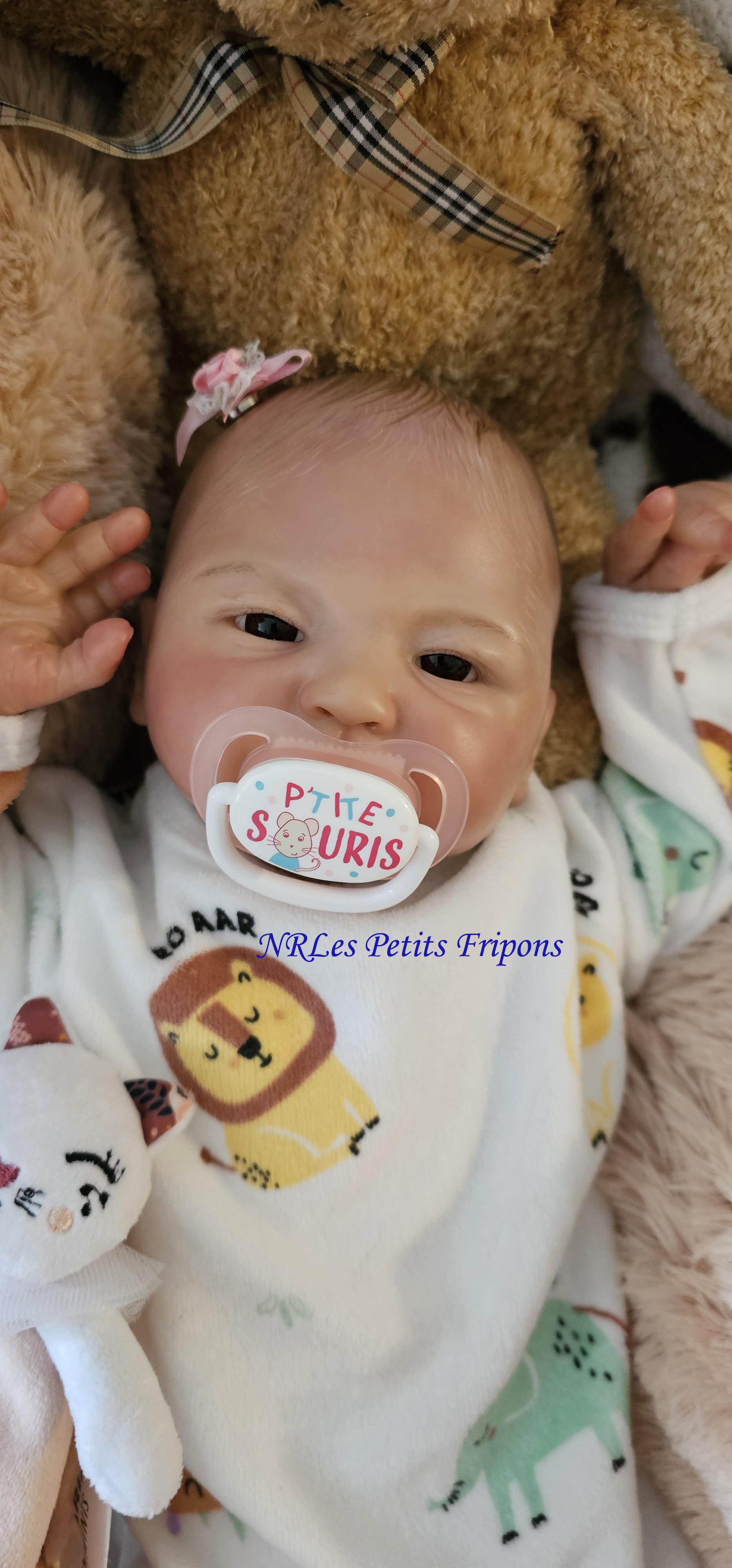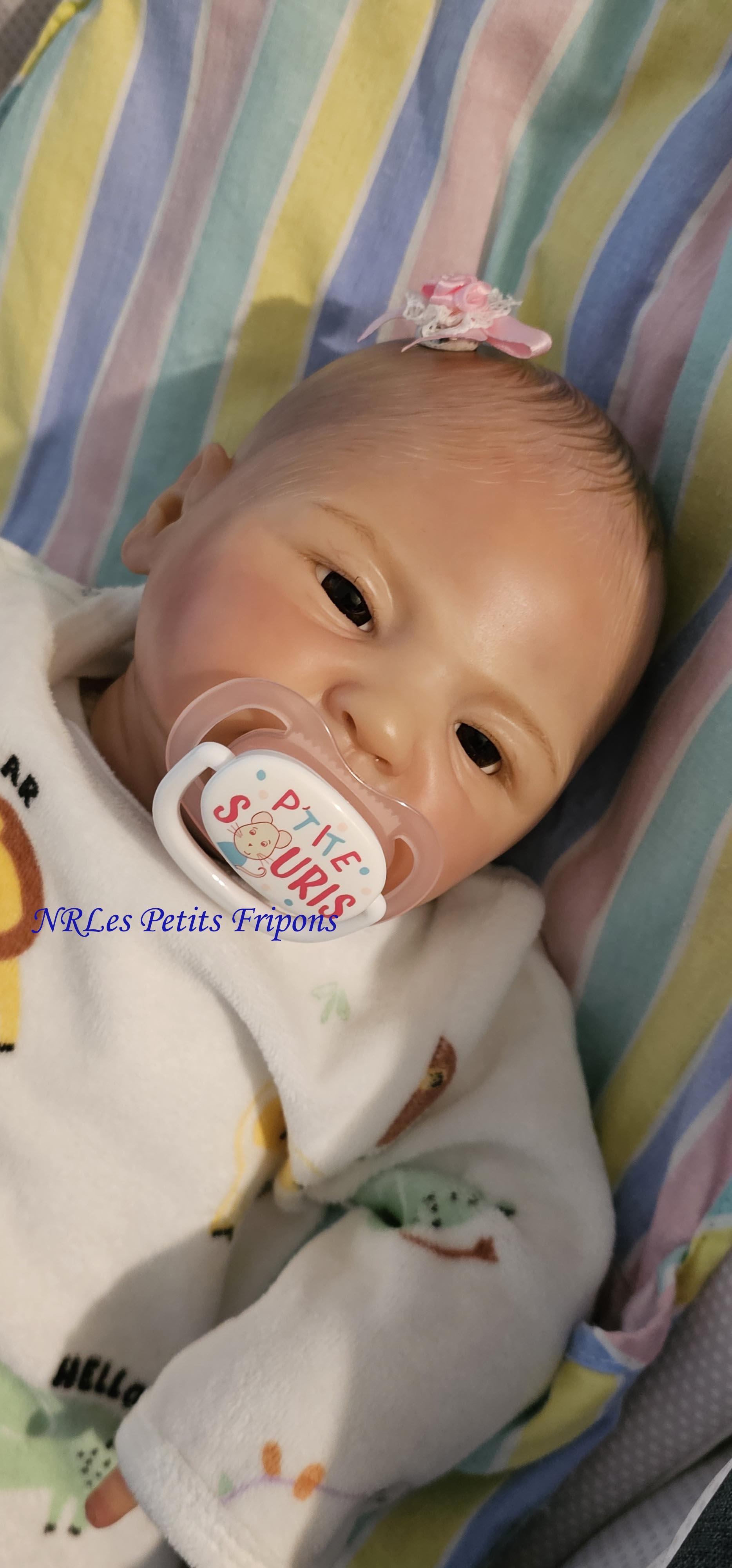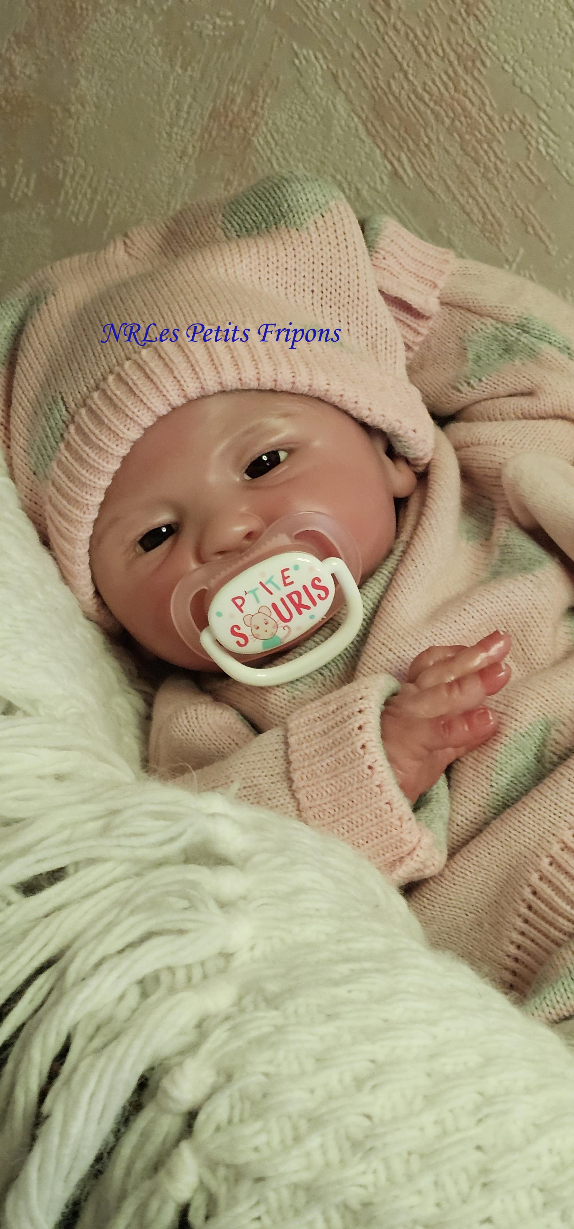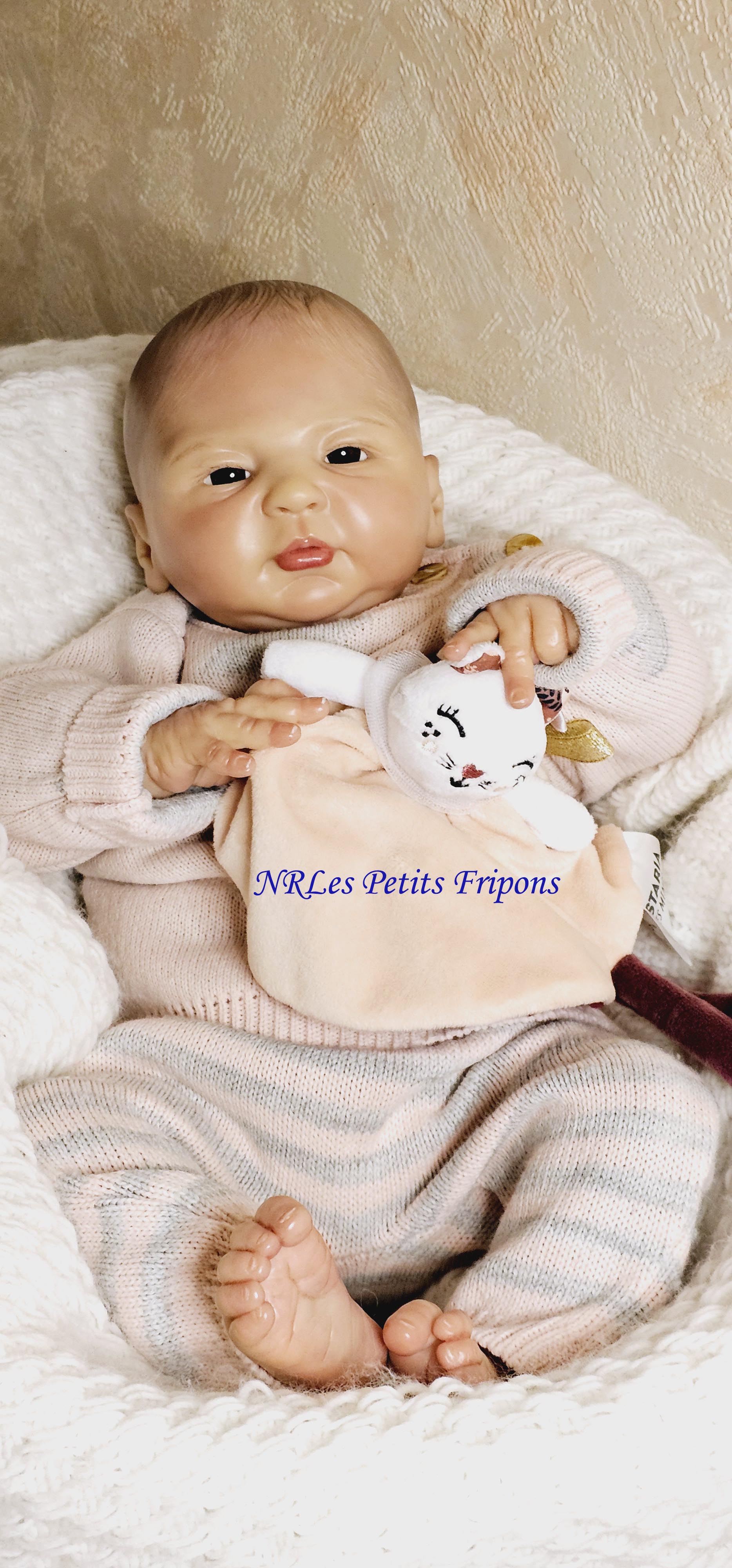 Majara a un petit teint mat, le ventre en tissu et les membres entiers en vinyle peint à l’acrylique Ultimate Fusion™ dans les règles du Reborning avec griffures, veines, ongles, tête qui tombe en arrière, hair painting, cils en Mohair Susan Nagel et sourcils peints, des yeux en verre marron. Majara a 3 couches de vernis mat de finition.Elle porte un aimant à la bouche et sur le côté droit de la tête