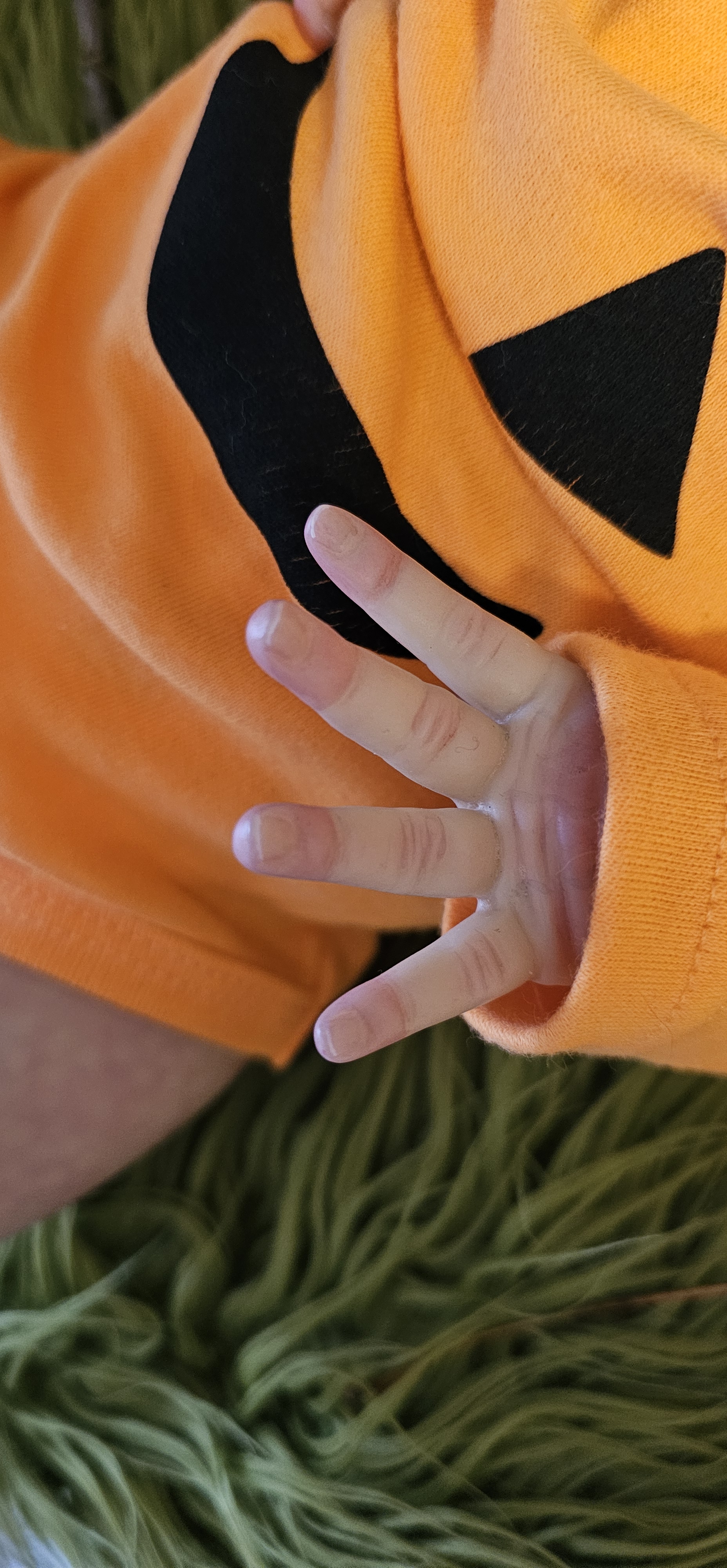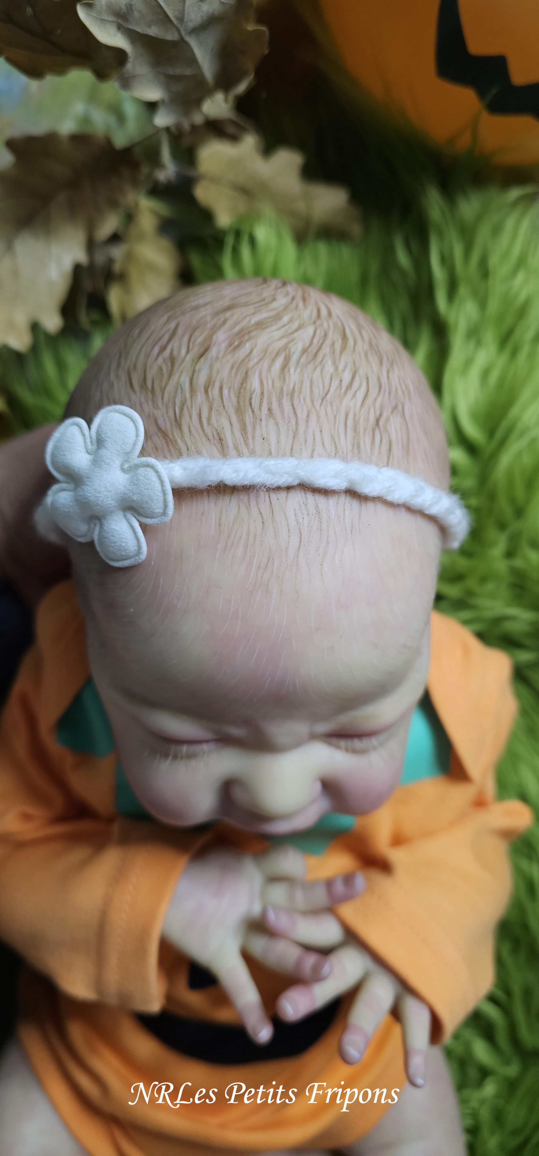 Gracie Mae a un ventre en tissu (lesté de billes de verre et ouate), les membres entiers en vinyle peint à l’acrylique Ultmate Fusion et Golden™ dans les règles du Reborning avec marbrures, rougeurs, veines, ongles, tête qui tombe, HP brun, cils châtain clair mohair Ju&Na et sourcils peints, des yeux dormant.