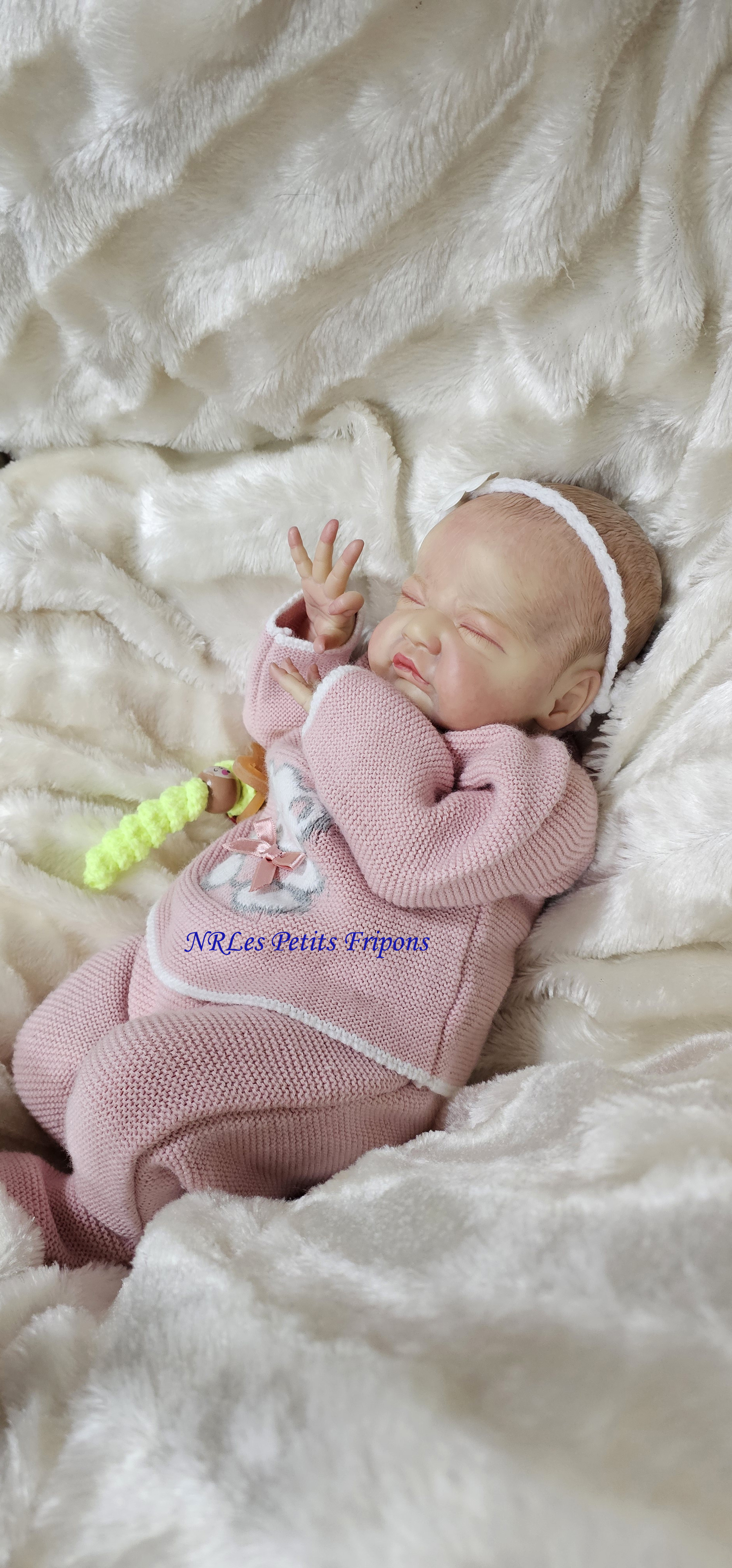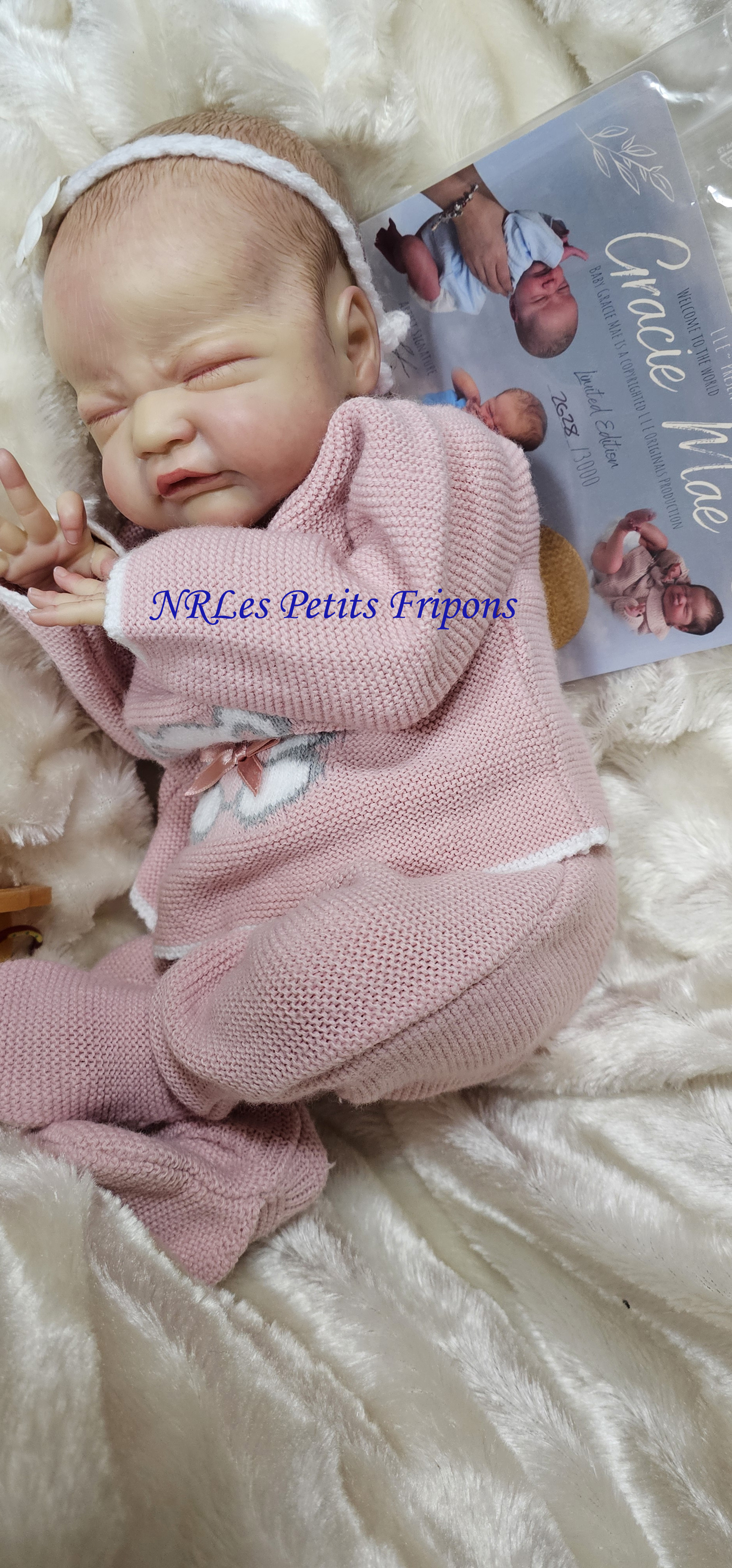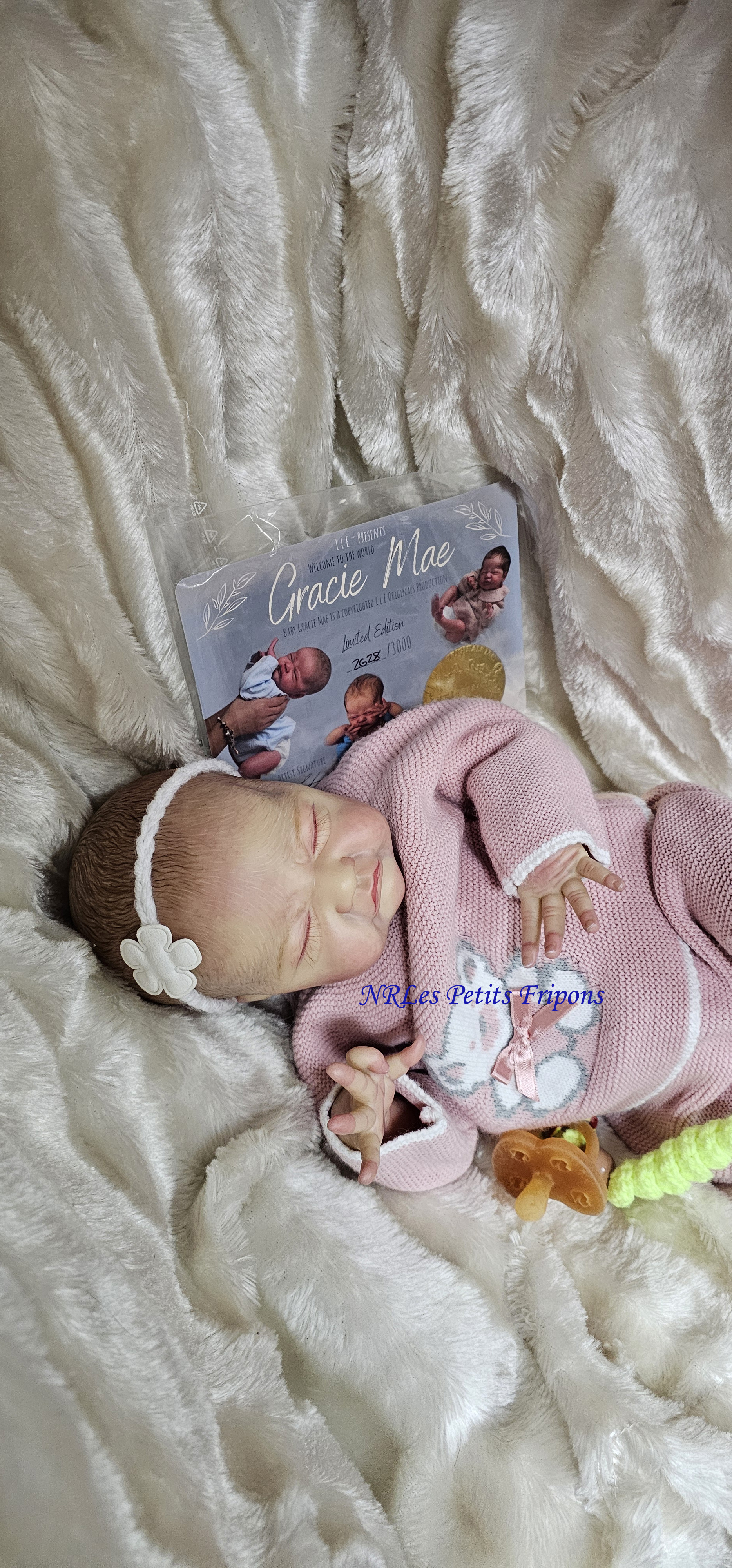 Gracie est à 420 euros : partira avec son trousseau (biberon, doudou, plaque odorante, couches, couverture, tenue de jour, tenue de nuit) ainsi que son certificat de naissance, son bracelet de naissance, ses papiers de la nurserie et certificat d’authenticité