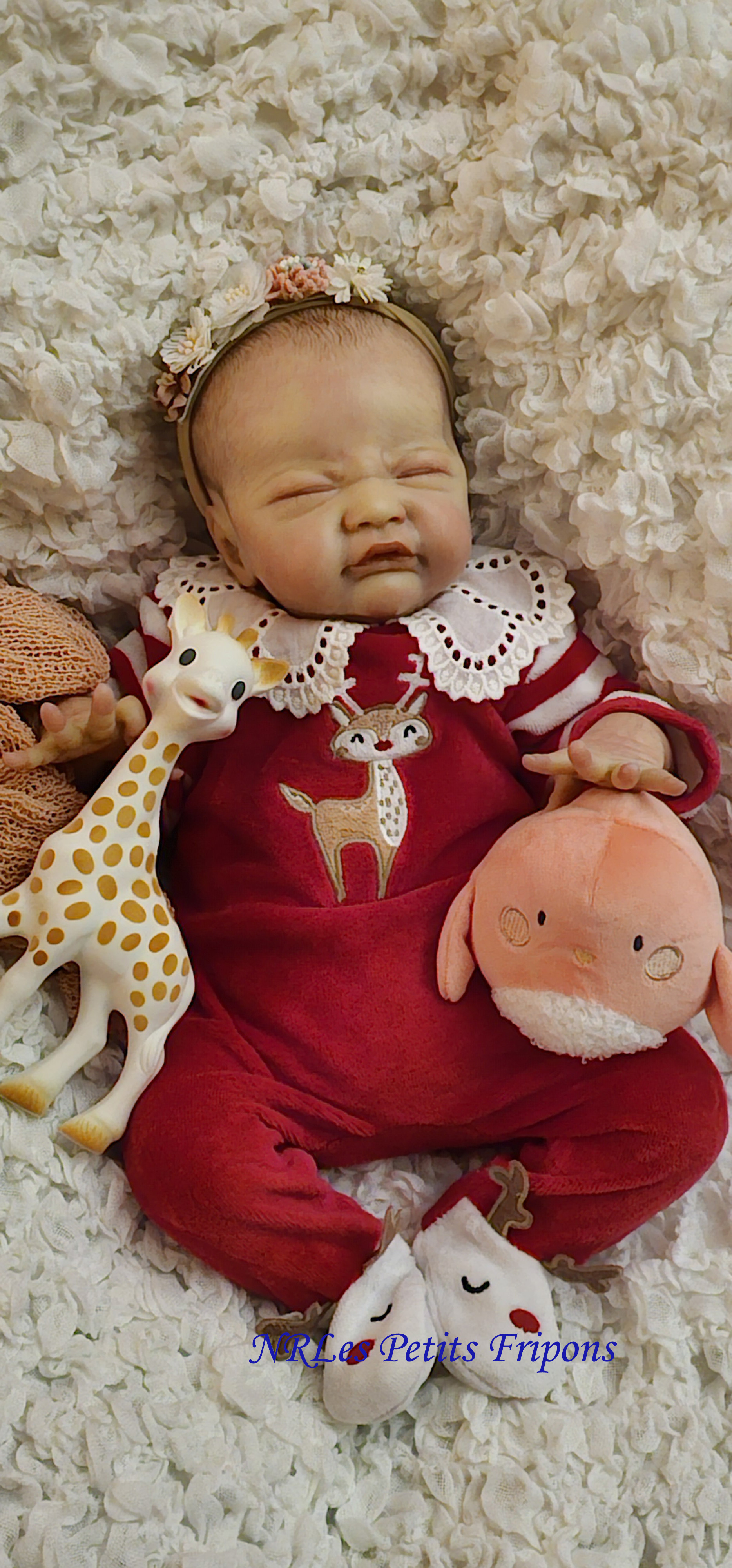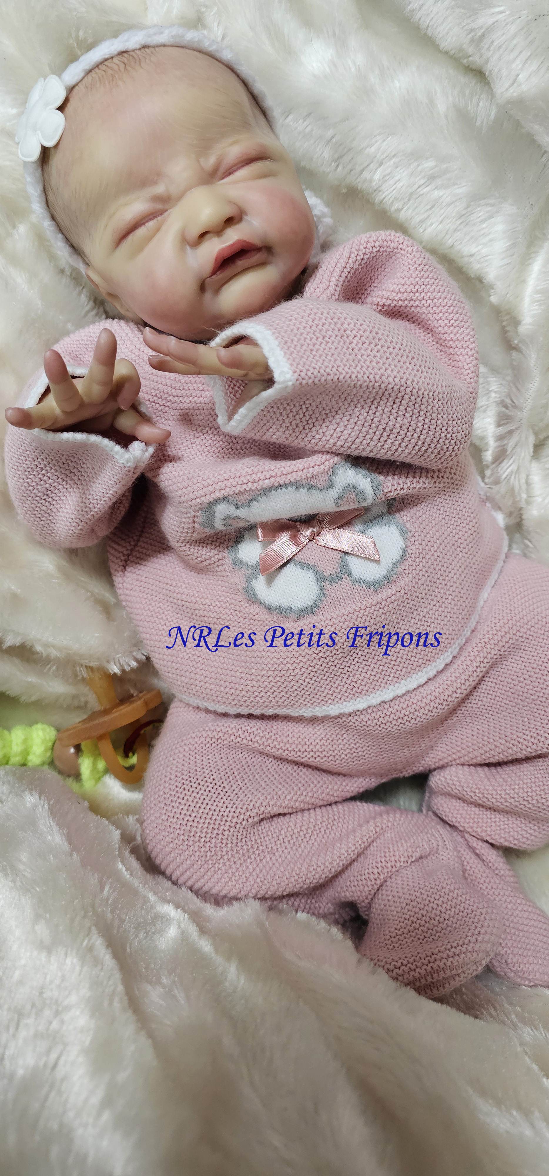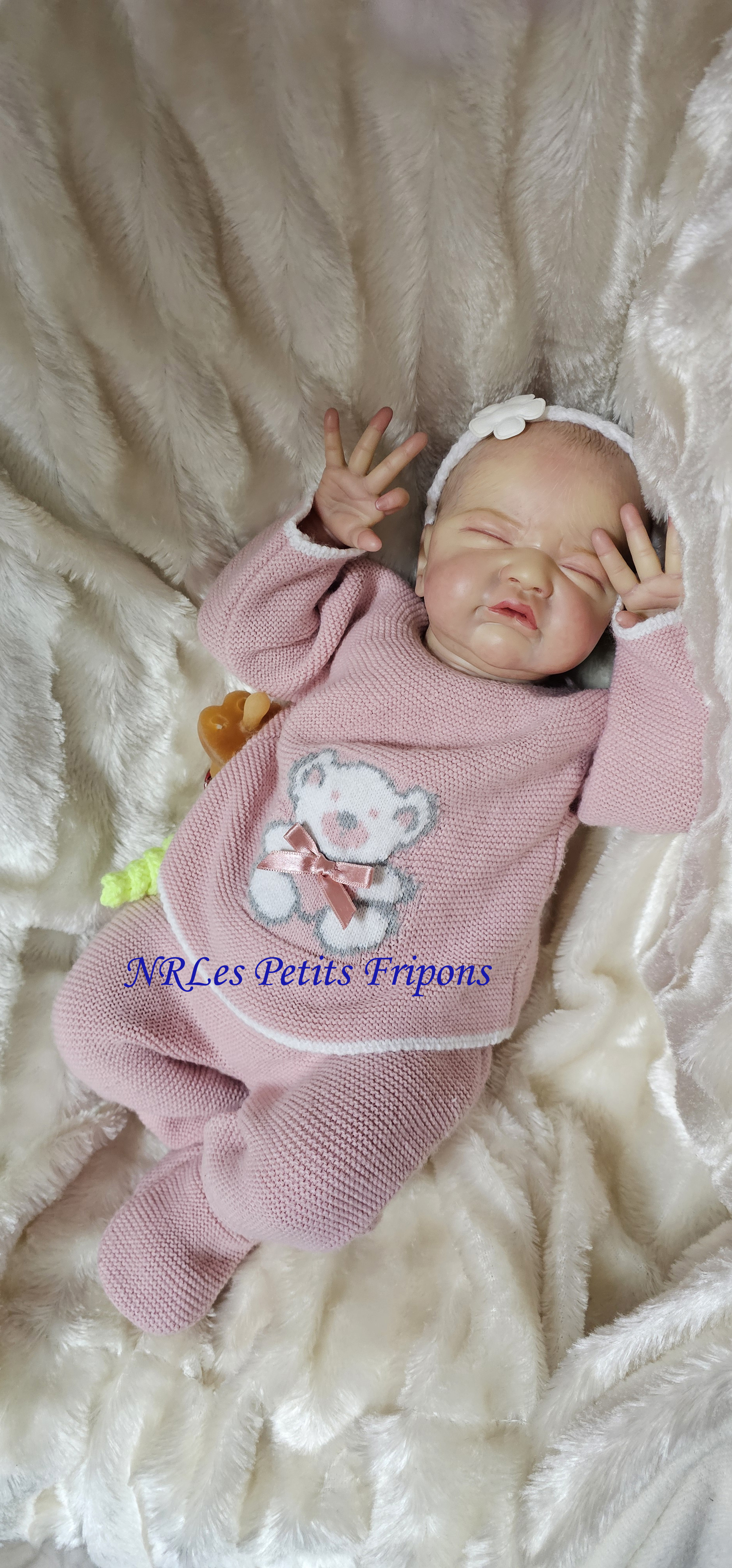 Gracie est à 420 euros : partira avec son trousseau (biberon, doudou, plaque odorante, couches, couverture, tenue de jour, tenue de nuit) ainsi que son certificat de naissance, son bracelet de naissance, ses papiers de la nurserie et certificat d’authenticité