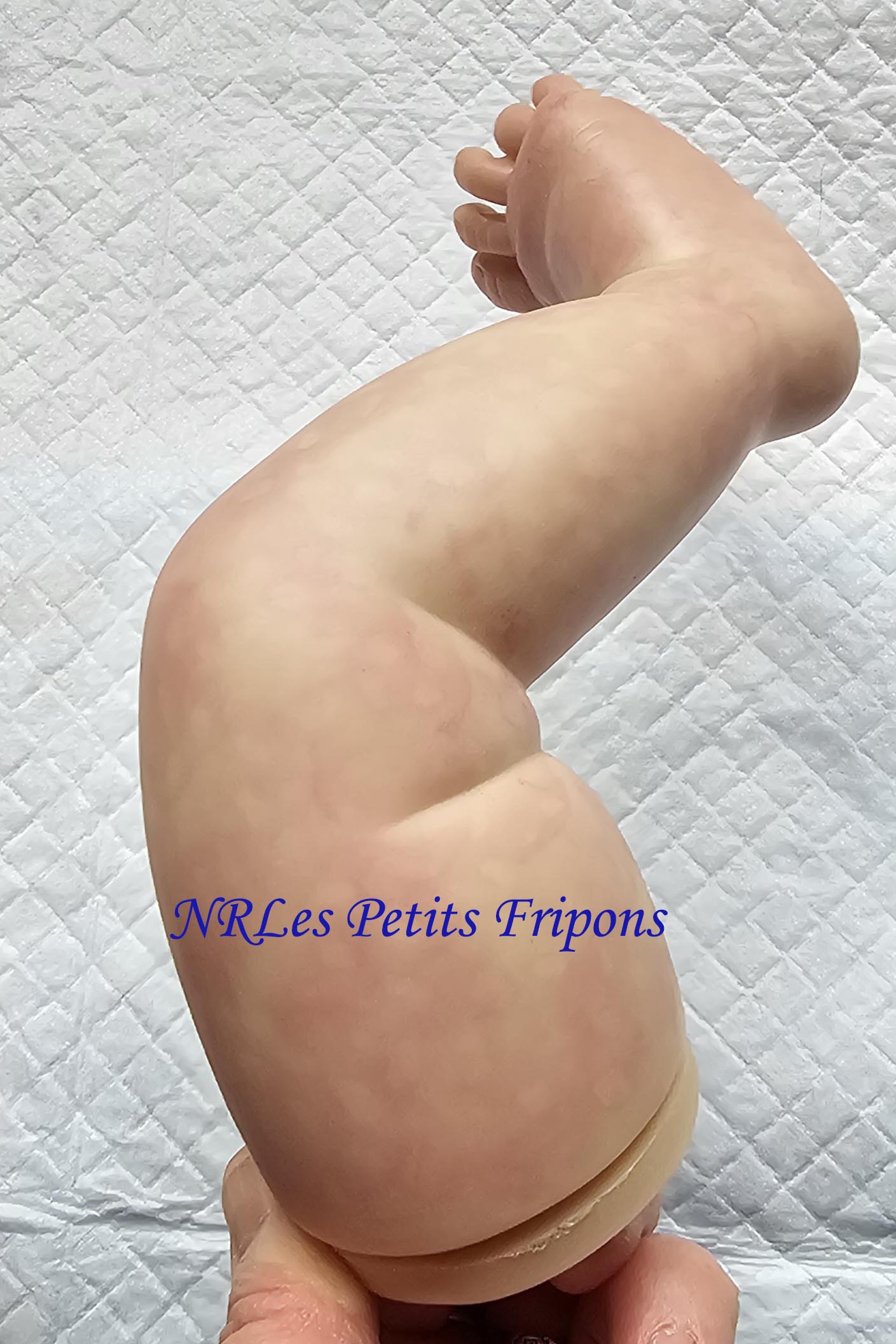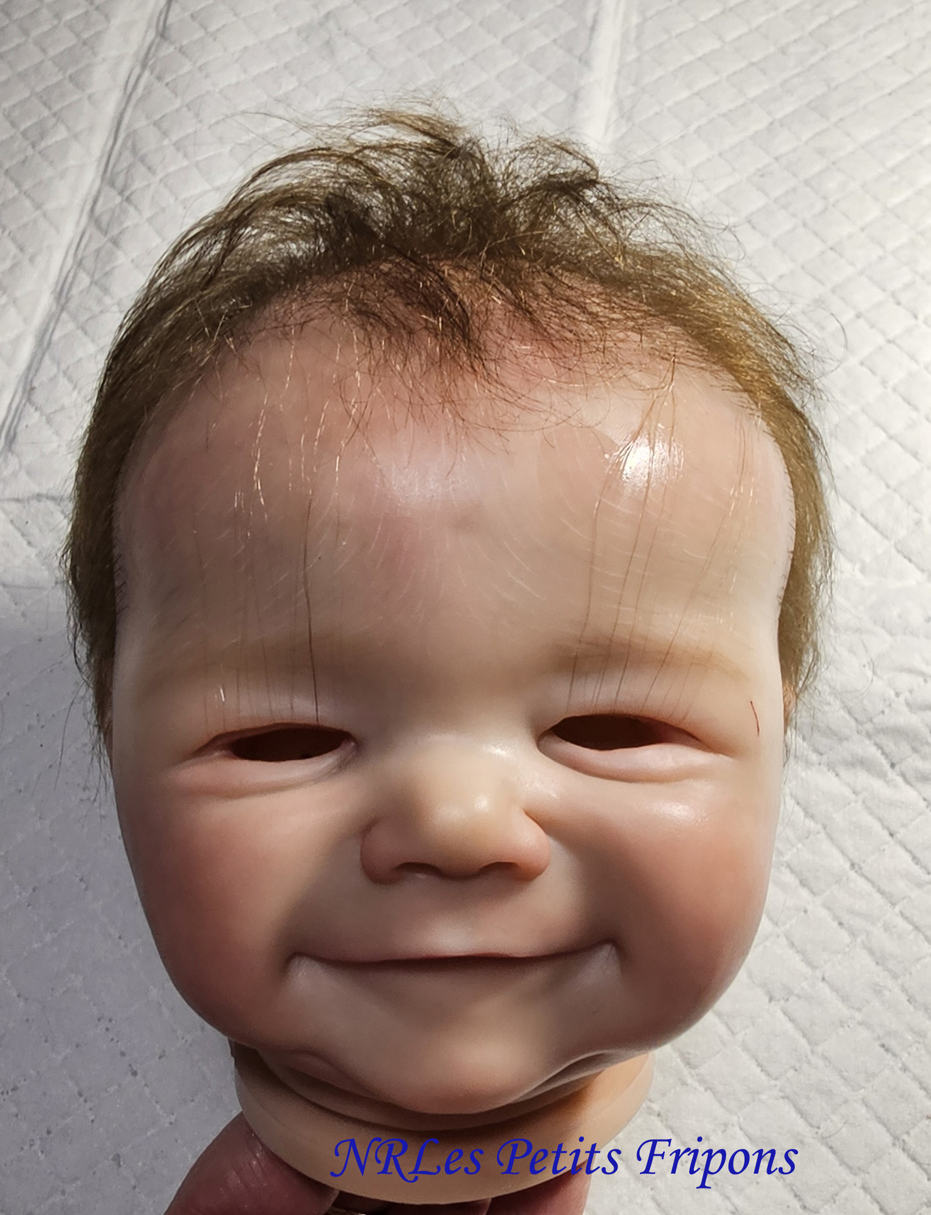 James a un ventre en tissu (lesté de billes de verre et ouate) les membres en vinyle peint à l’acrylique avec mes propres mélanges, dans les règles du Reborning avec veines, ongles, marbrures, rougeurs, griffures, capillaires… tête qui tombe et peut tenir assis, rooting brun (ondulé-bouclé si mouillé) avec mohair JU&Na de qualité, cils châtain clair mohair Ju&Na et sourcils peints, des yeux bleus 18mm de Lauscha soufflés à la bouche